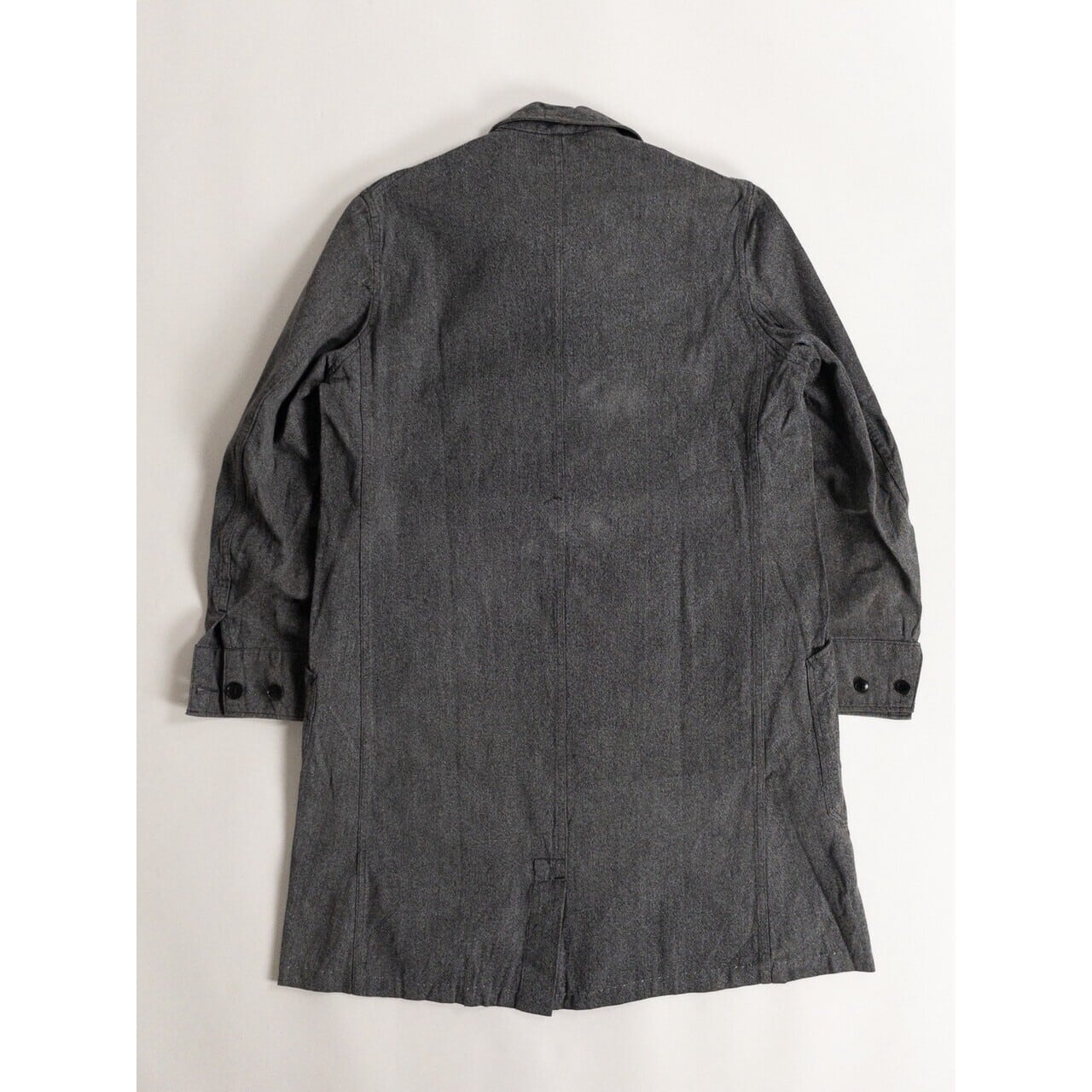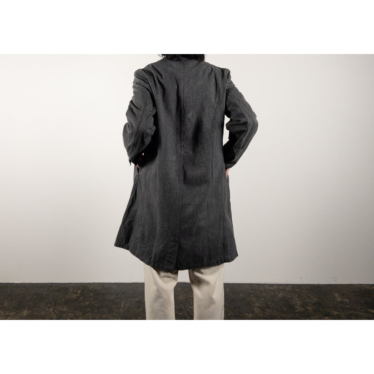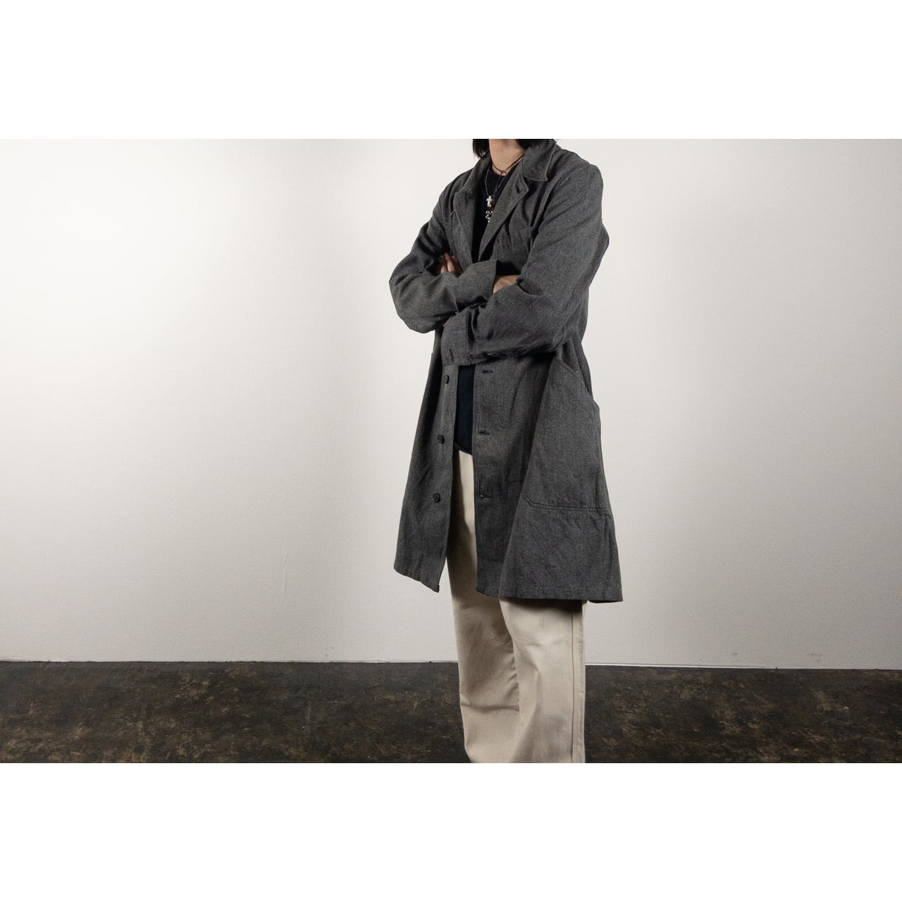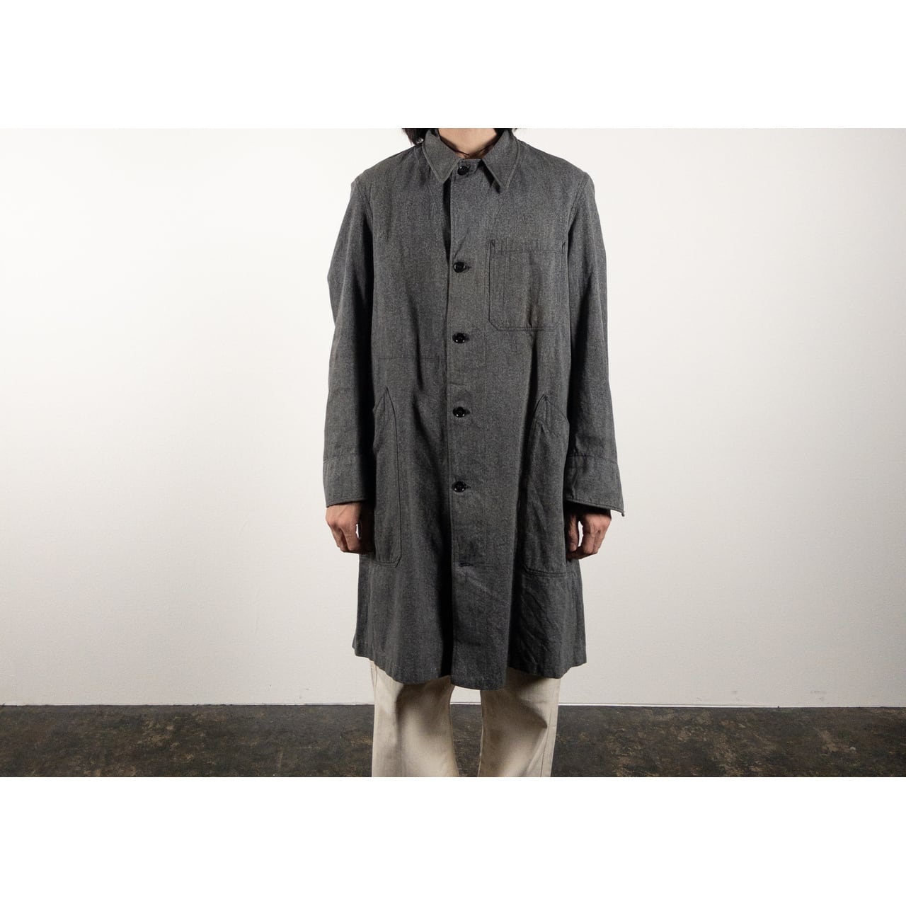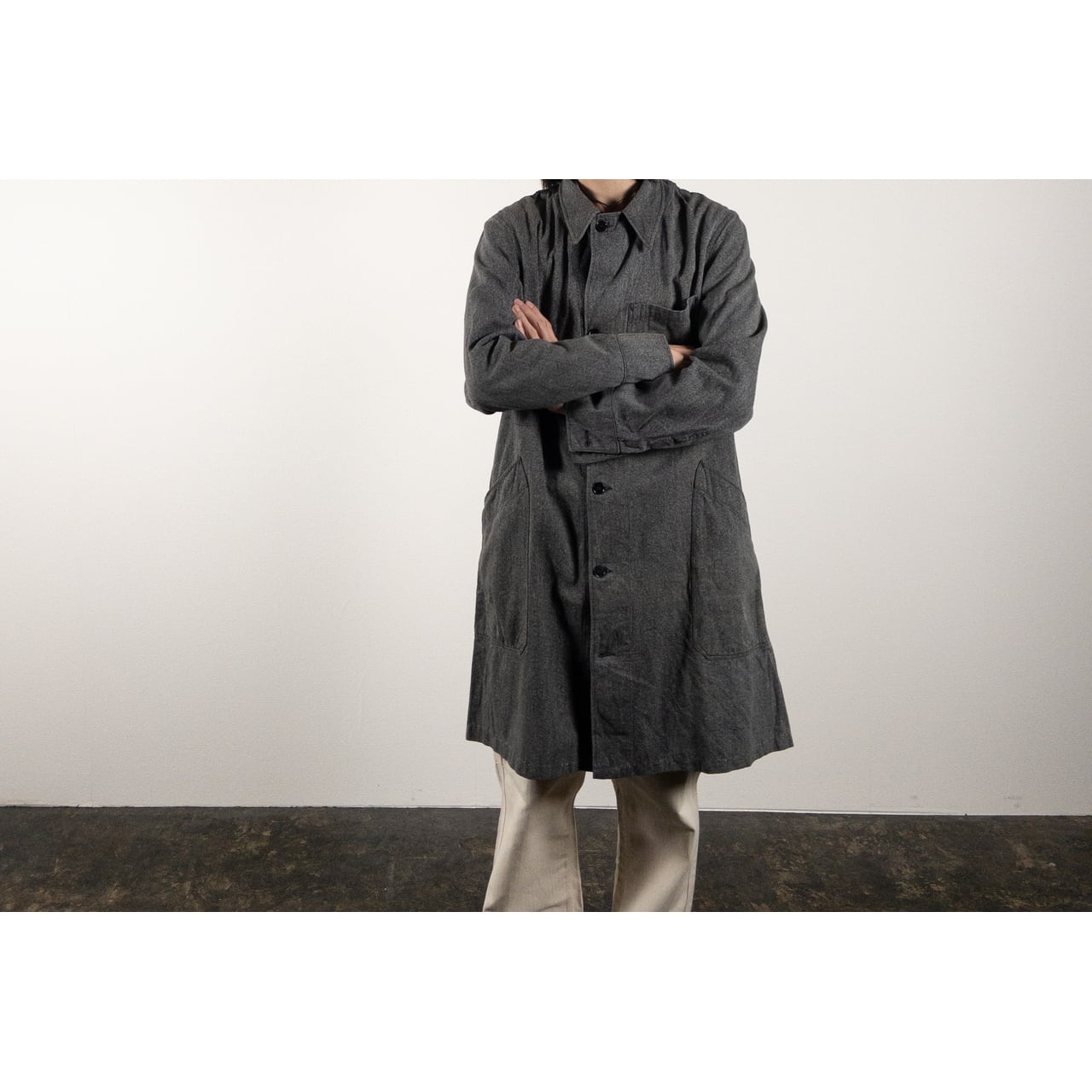 シルエットはロング丈で、羽織るだけで全体のバランスを美しく見せてくれるのもポイントです。ワークウェアとしての実用性と、フランス軍らしい品の良さが共存した特別な一着。