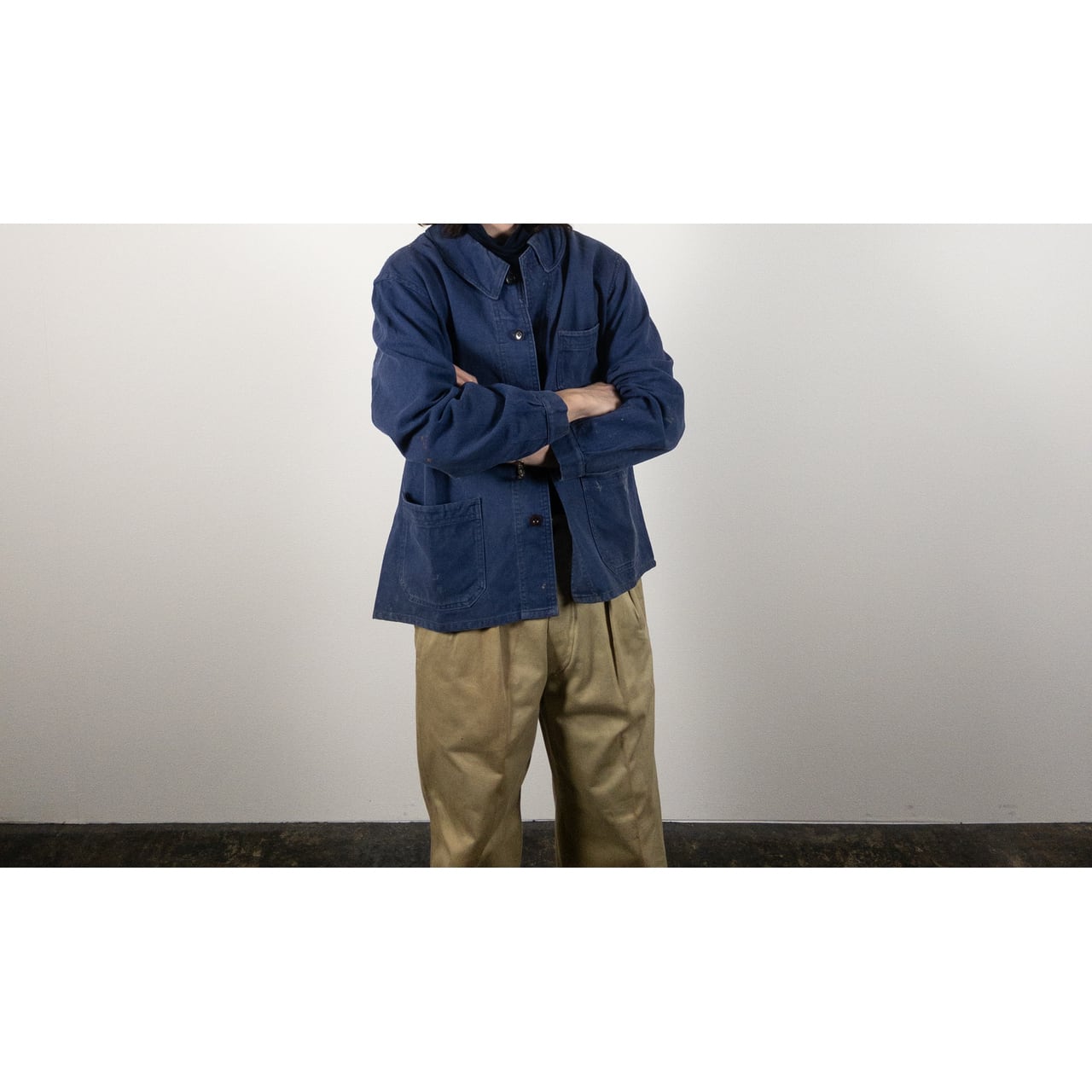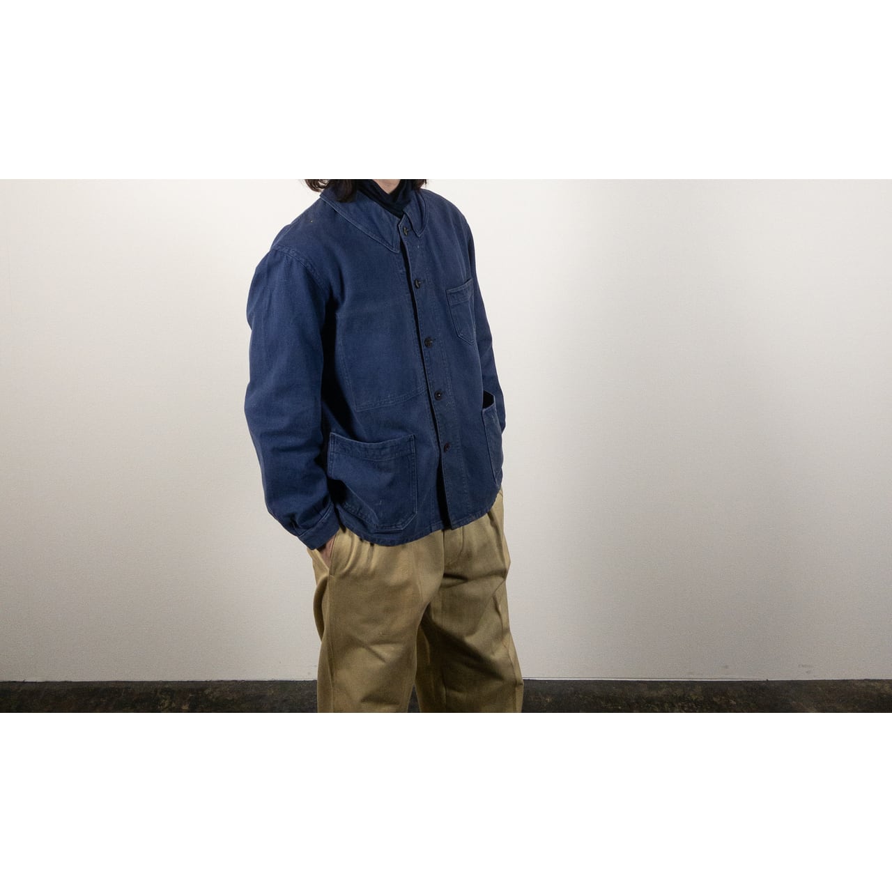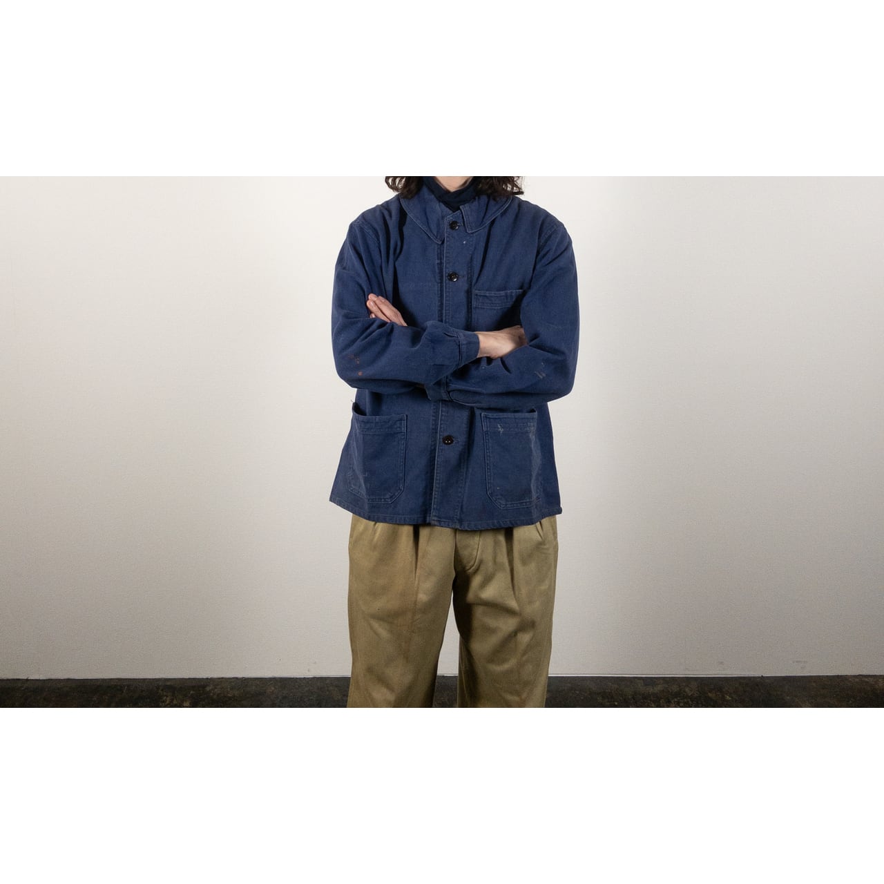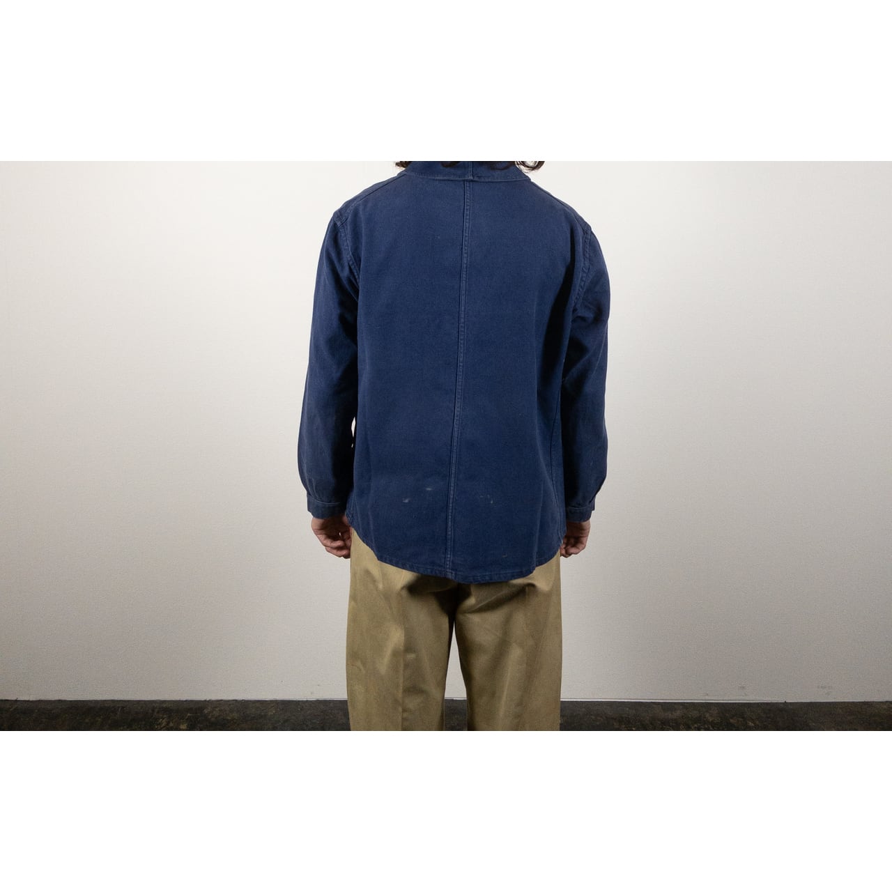 フレンチワークを象徴する素材と年代らしい、実直で飾り気のない佇まいが魅力の一着です。奇をてらわないデザインだからこそ、生地感や細かなディテールがより際立ちます。