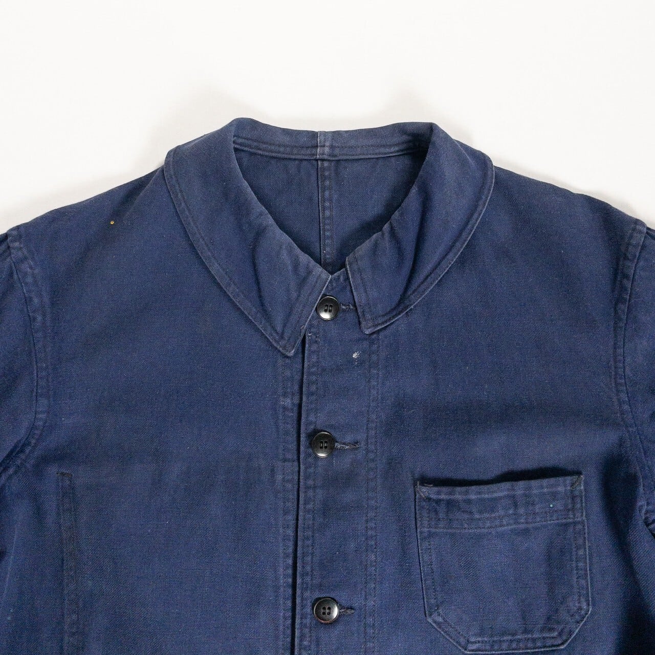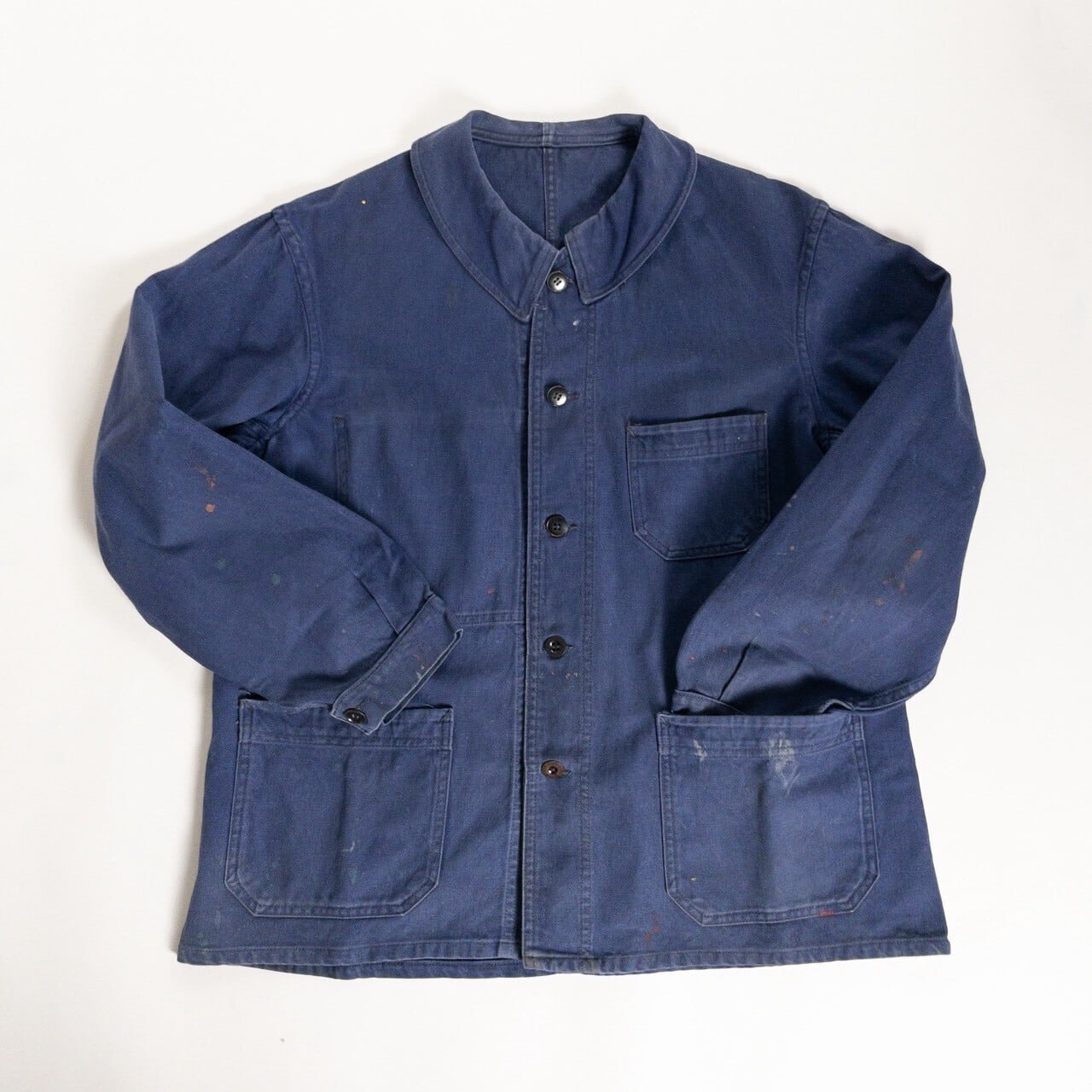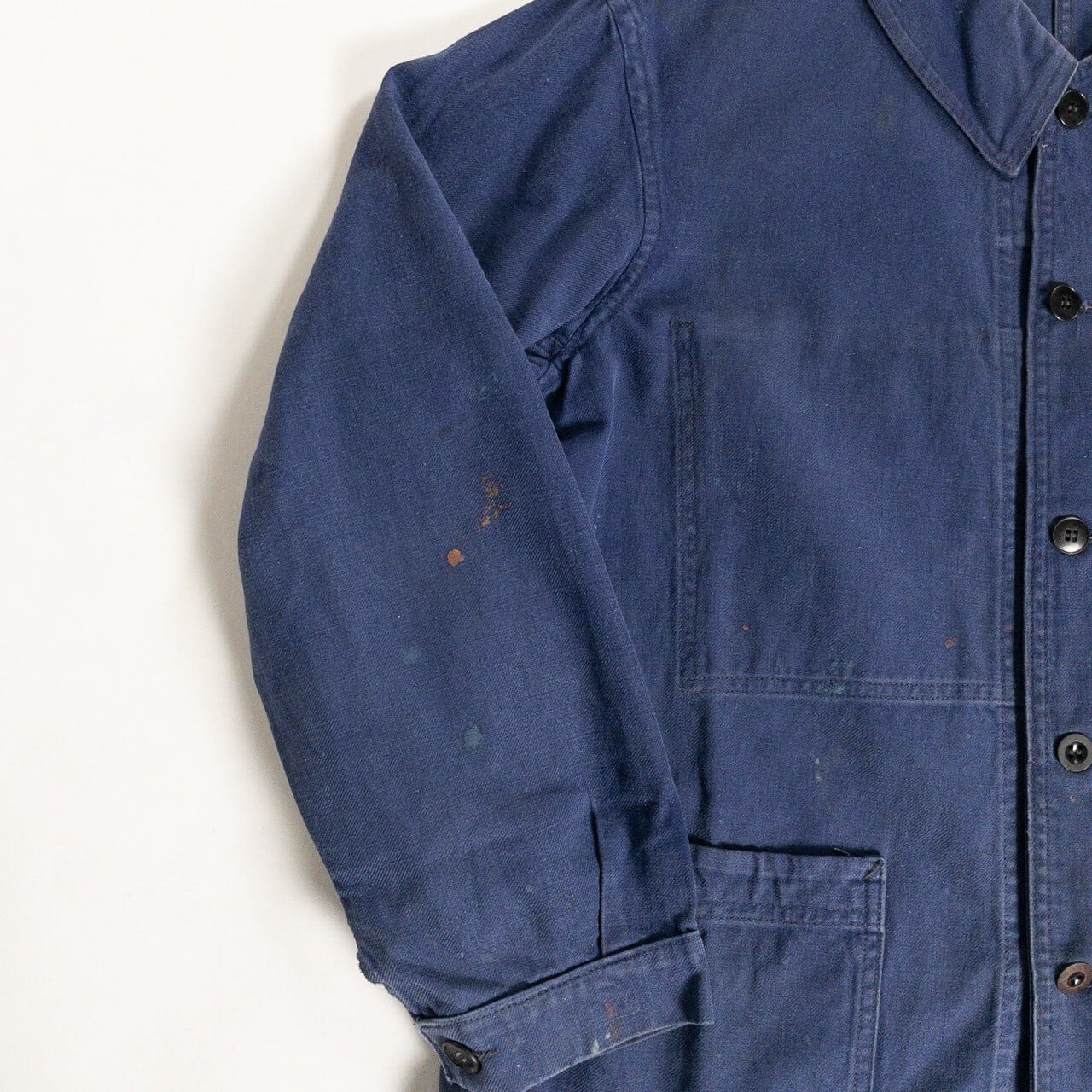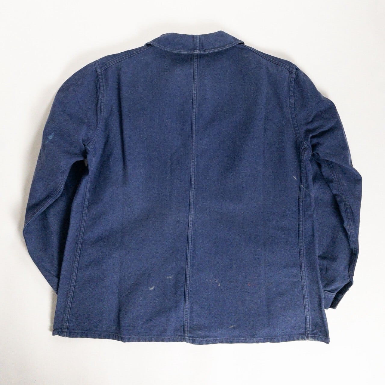 フレンチワークを象徴する素材と年代らしい、実直で飾り気のない佇まいが魅力の一着です。奇をてらわないデザインだからこそ、生地感や細かなディテールがより際立ちます。