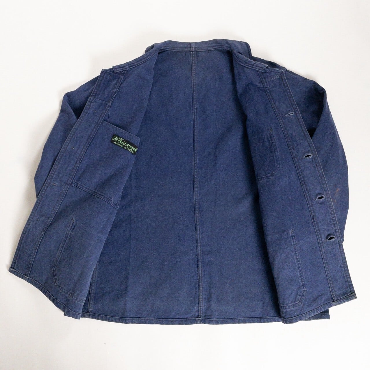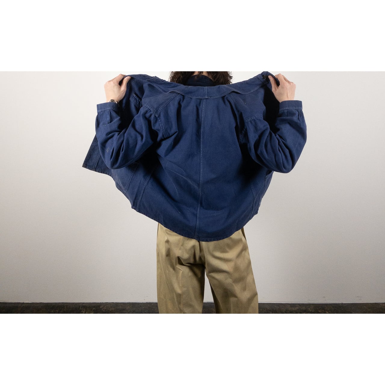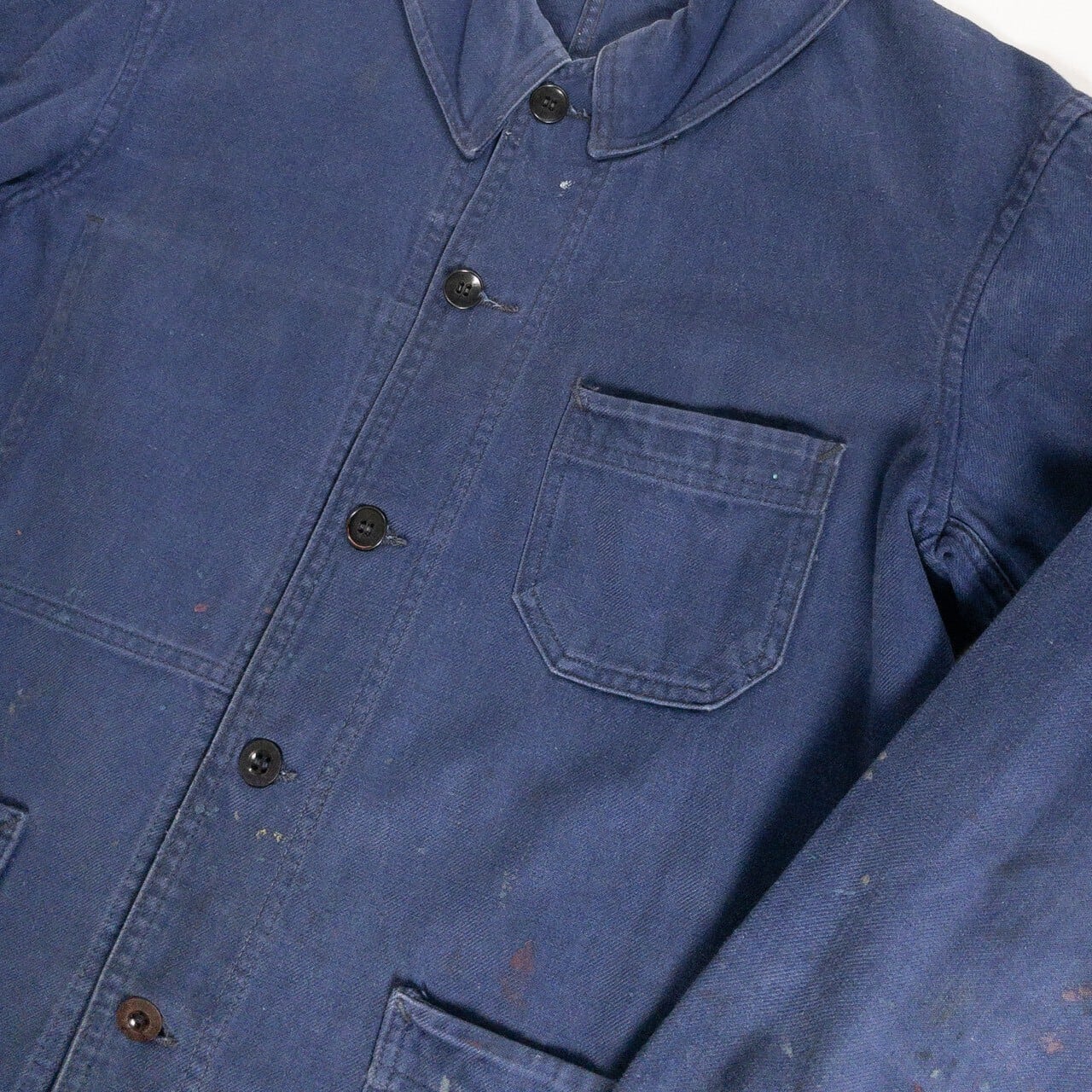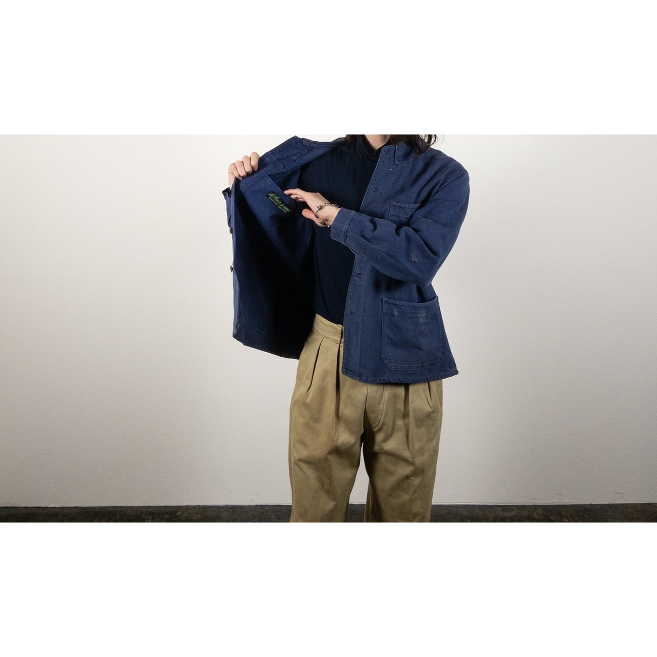 フレンチワークを象徴する素材と年代らしい、実直で飾り気のない佇まいが魅力の一着です。奇をてらわないデザインだからこそ、生地感や細かなディテールがより際立ちます。