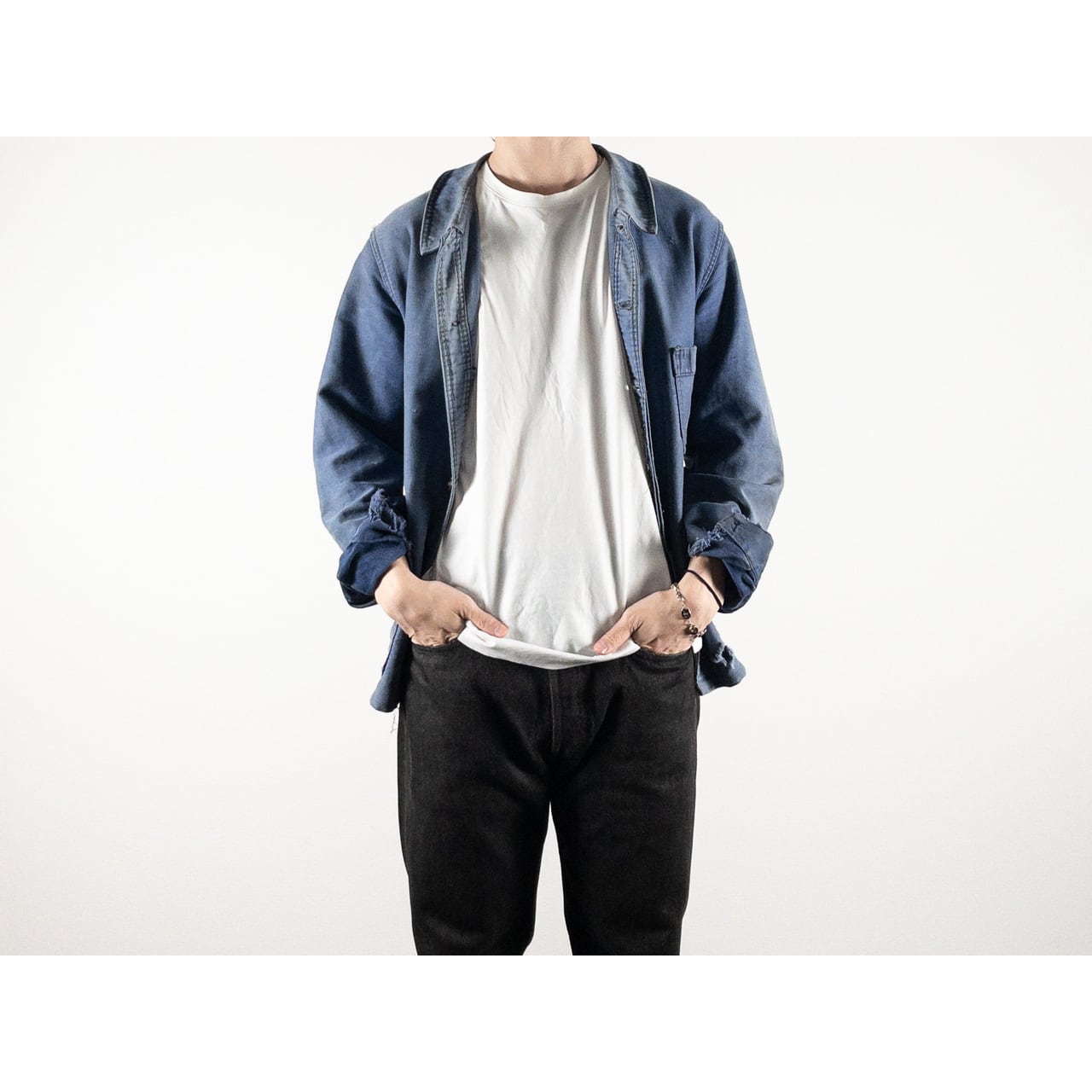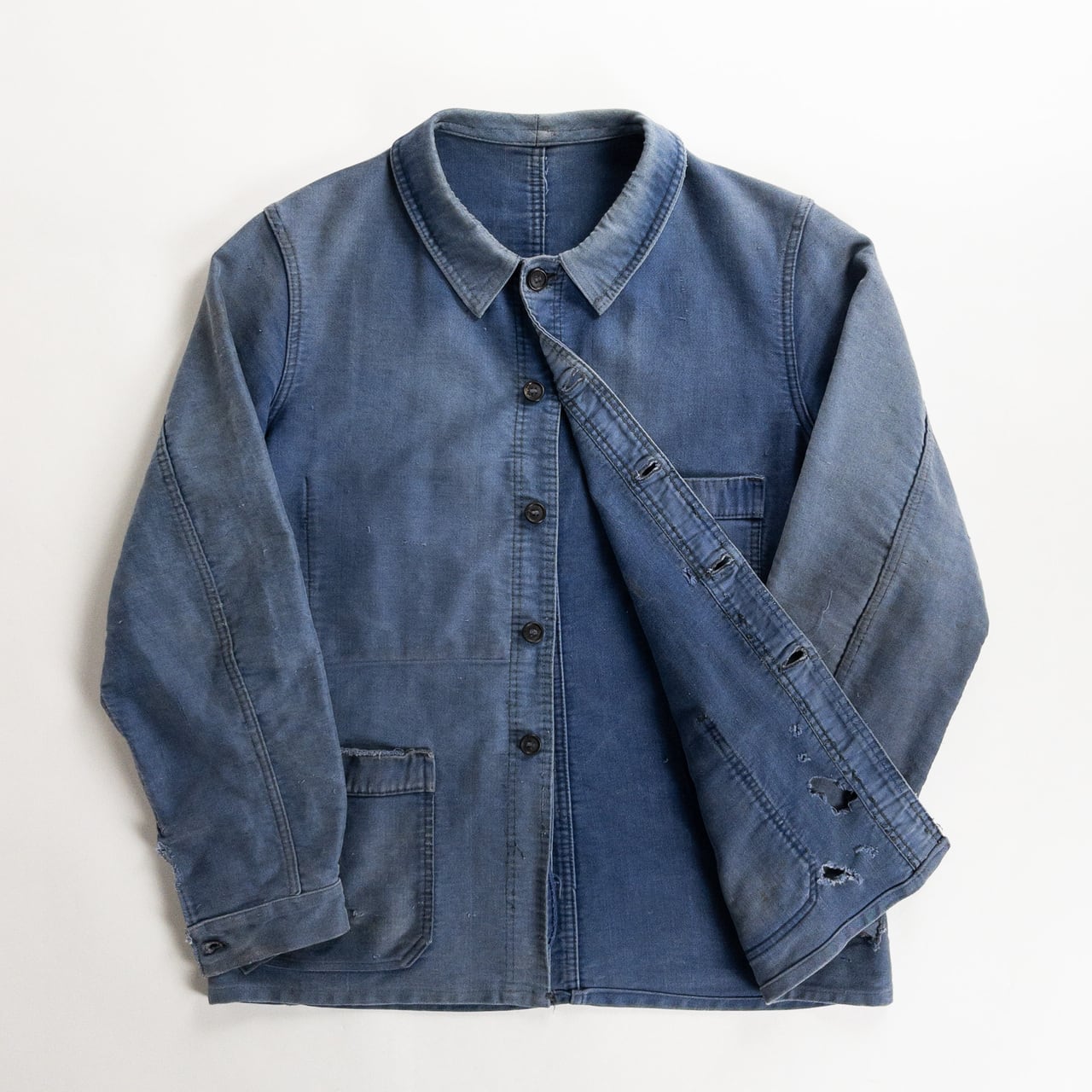フレンチヴィンテージのブルーモールスキンをお探しだった方、よくフェードした一点物のワークジャケットをお探しだった方は、是非ともこの機会にご検討ください。