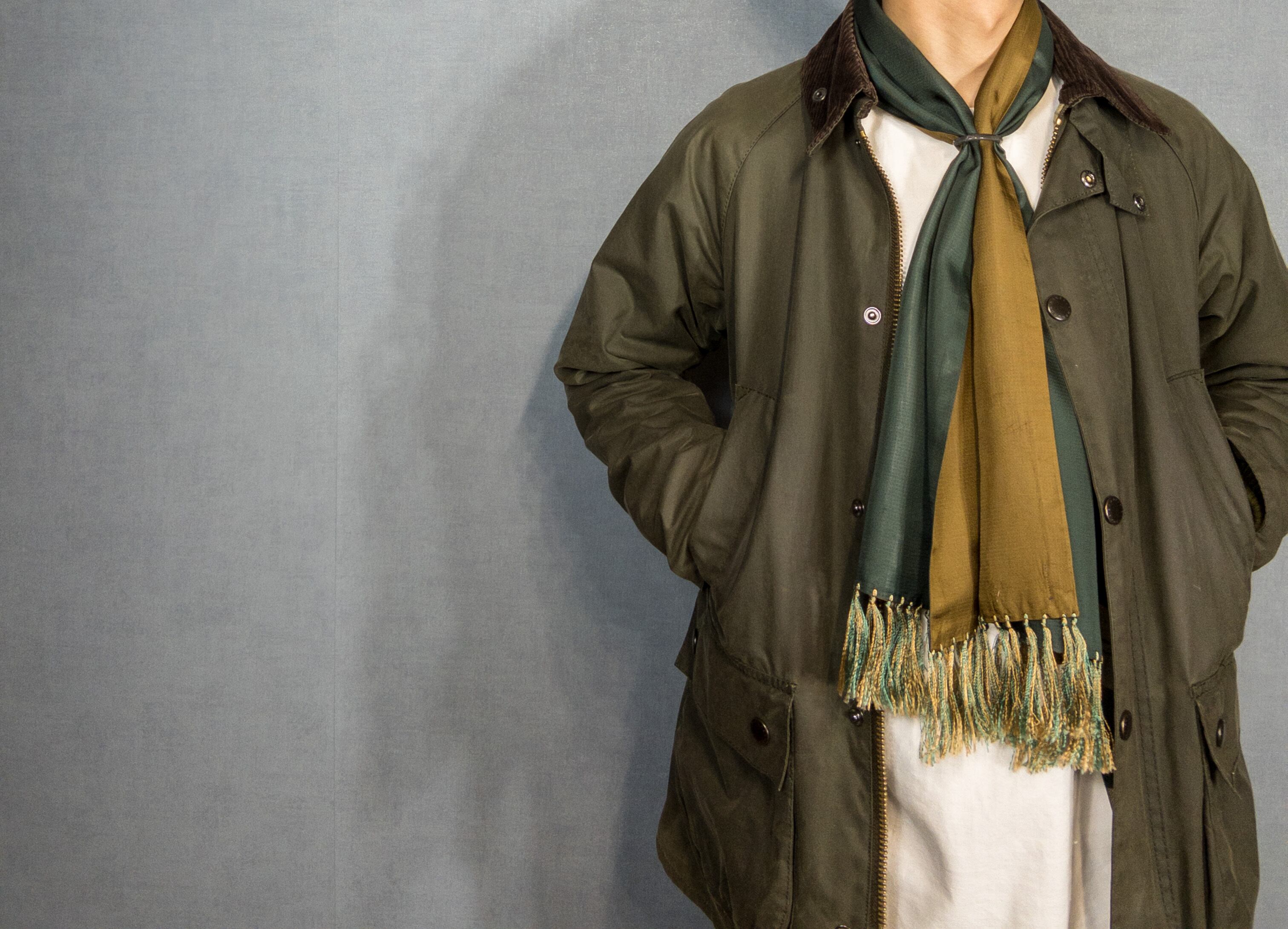 ベーシックな装いやクラシックなスタイリングにスカーフを加えるだけでまとまり良くなりますので非常におすすめのアイテムの一つです。