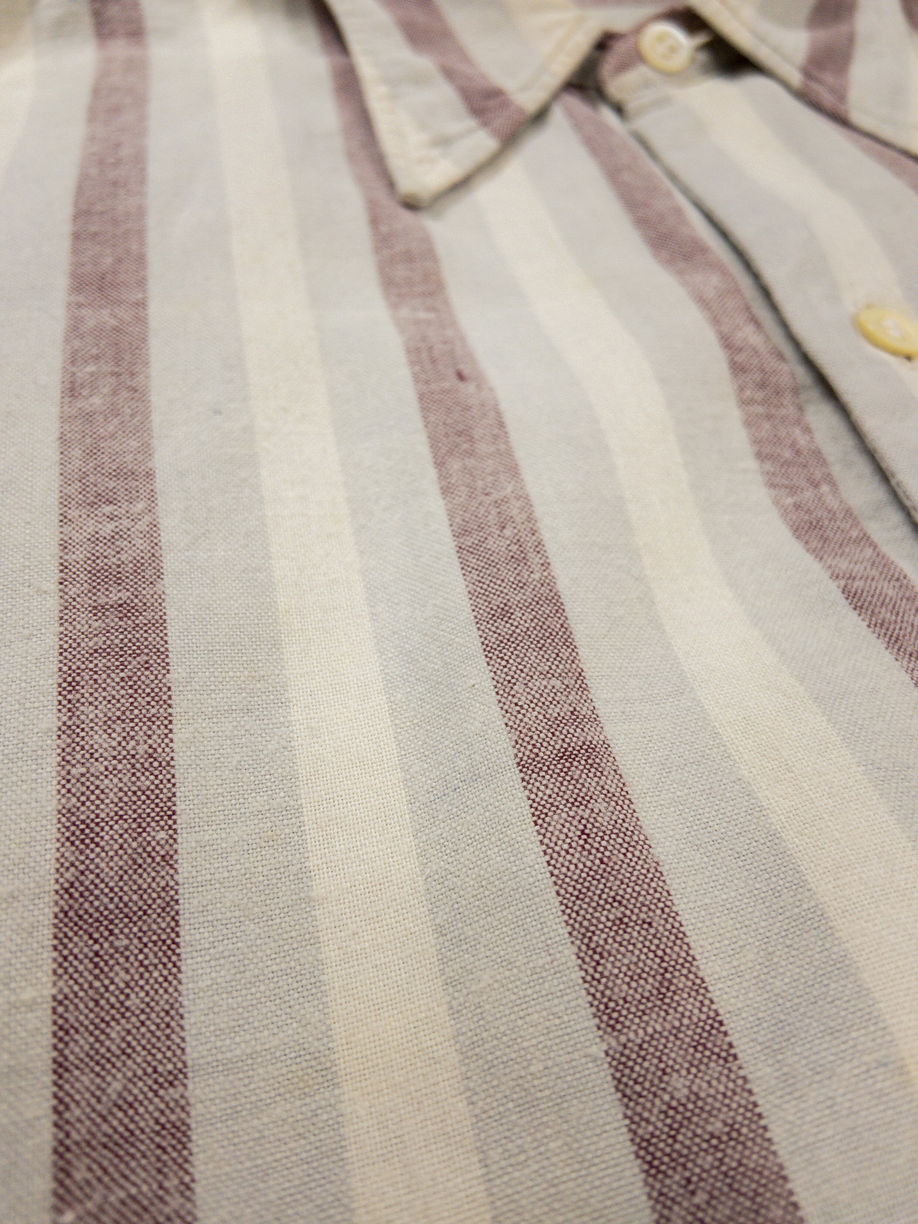 全体的にフェードしたような色味で、淡いレッドのようなバーガンディのような線、淡いブルーの線、オフホワイトの線で構成されたストライプが非常に印象的なシャツです。