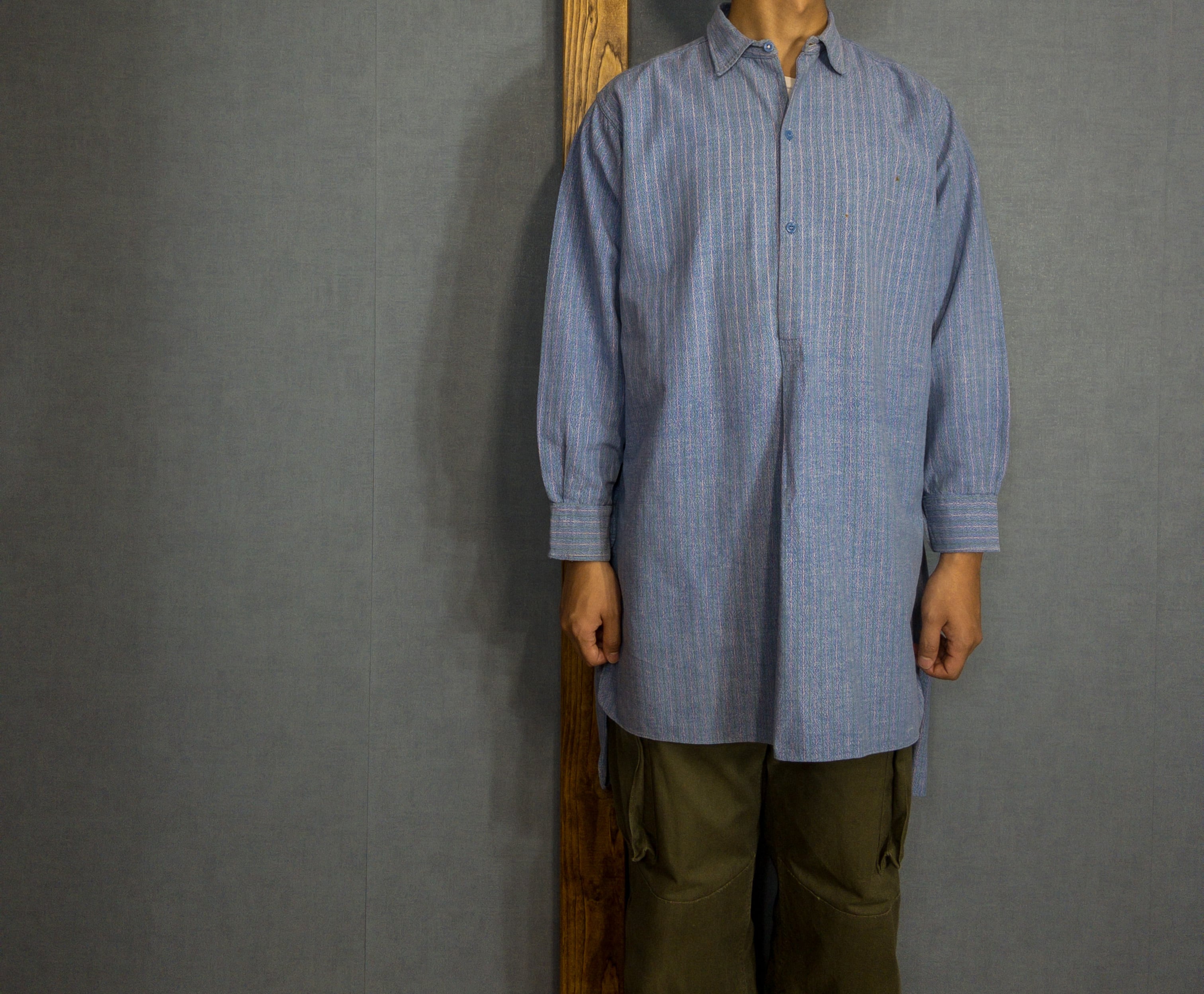 【1950s】French Vintage Blue Striped Cotton Grandpa/Pullover Work Shirt 7