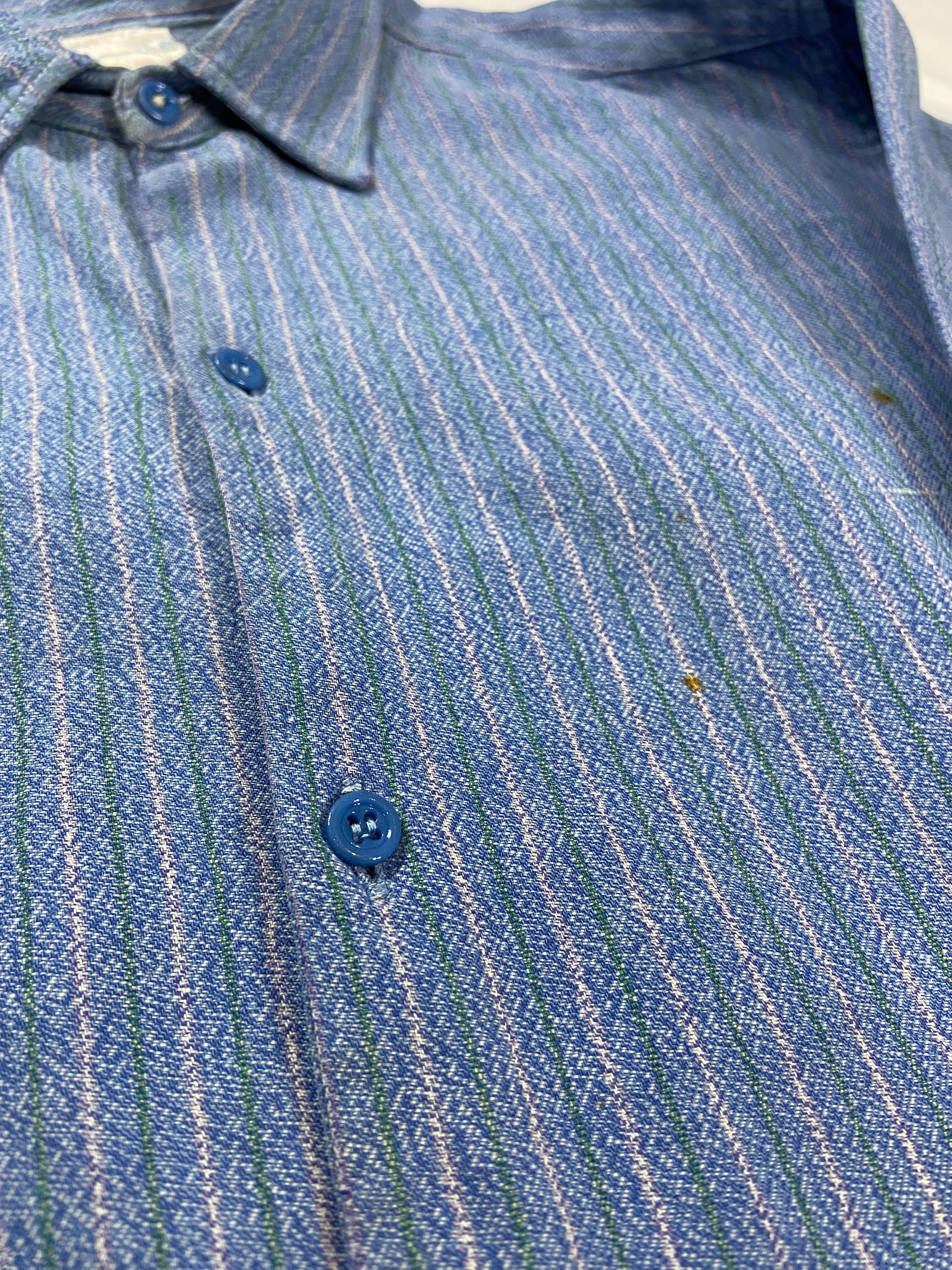 深いブルーをベースにグリーンとホワイトのストライプでブルーのボタン。色鮮やかな感じがいかにもフランスらしいです。フランスのヴィンテージはブルーの色味が絶妙で、このシャツは特にそれを感じます。