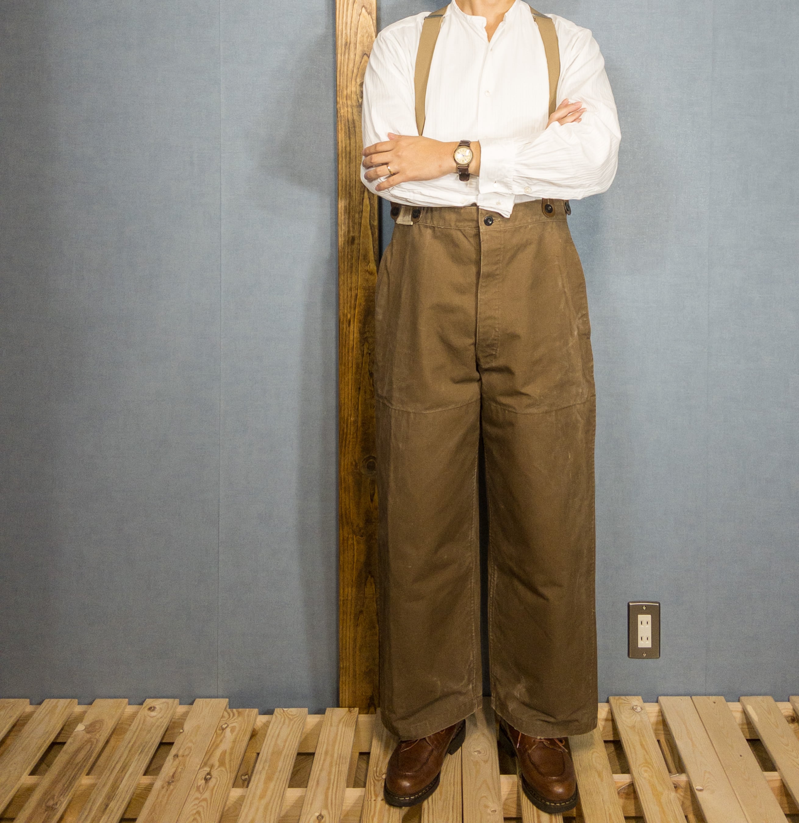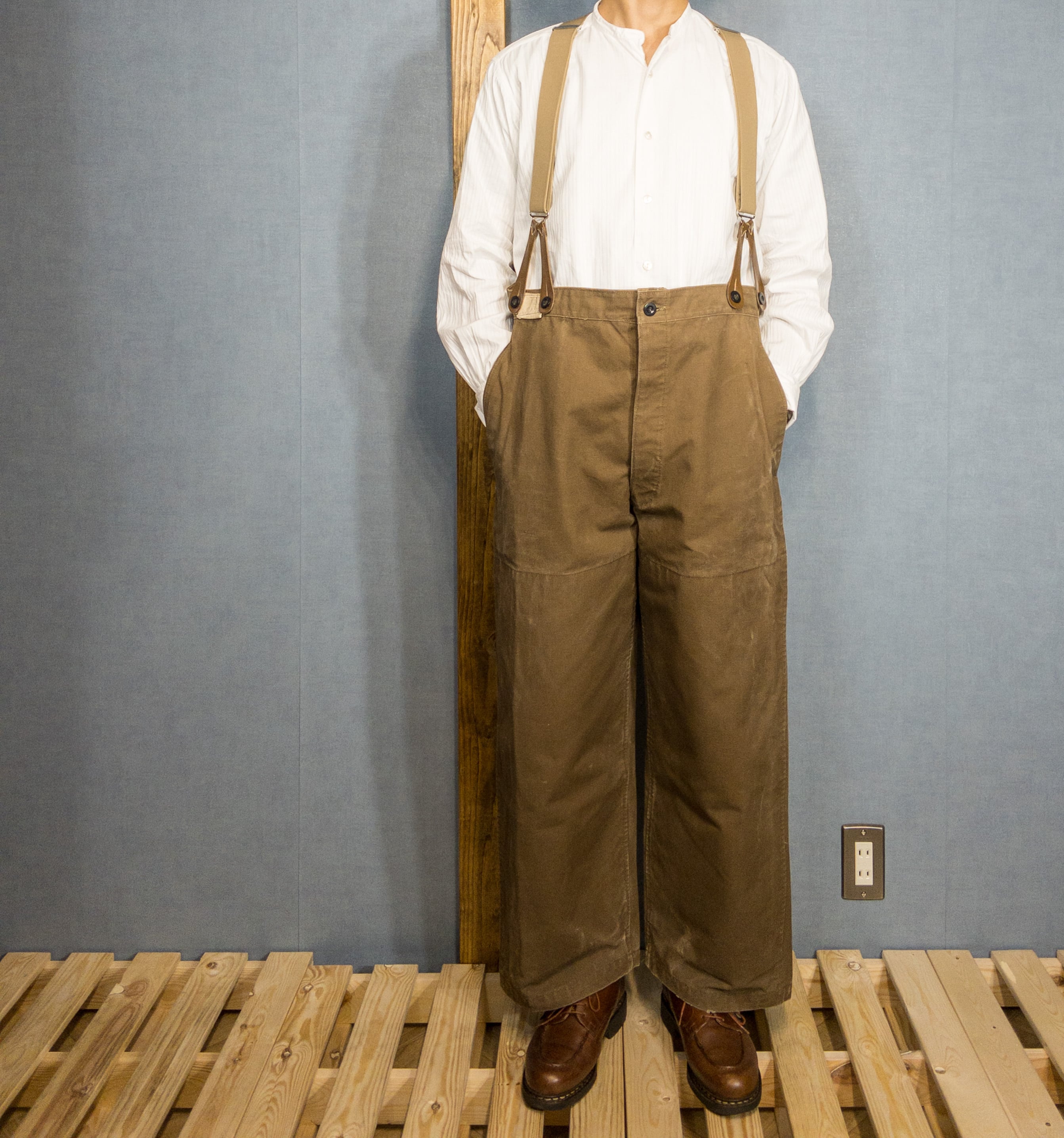 シンチバックにサスペンダーボタンとヴィンテージ好きにはたまらないディテールが満載で、絶妙なブラウンの色合いも素晴らしいパンツです。
