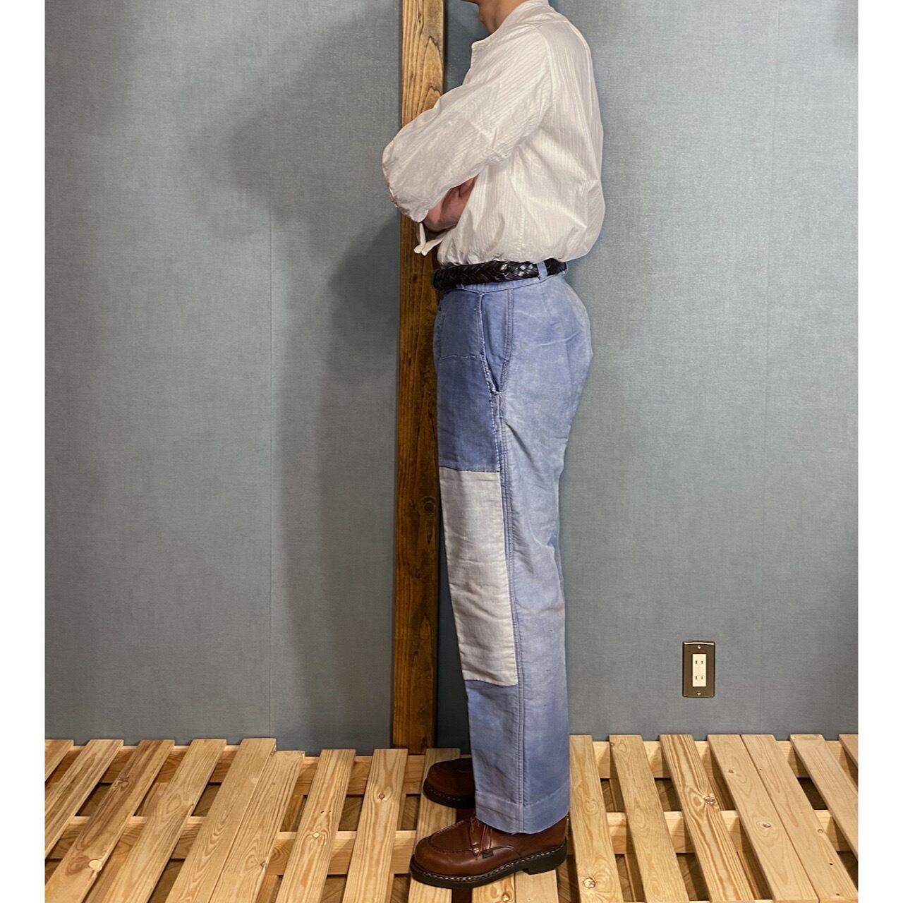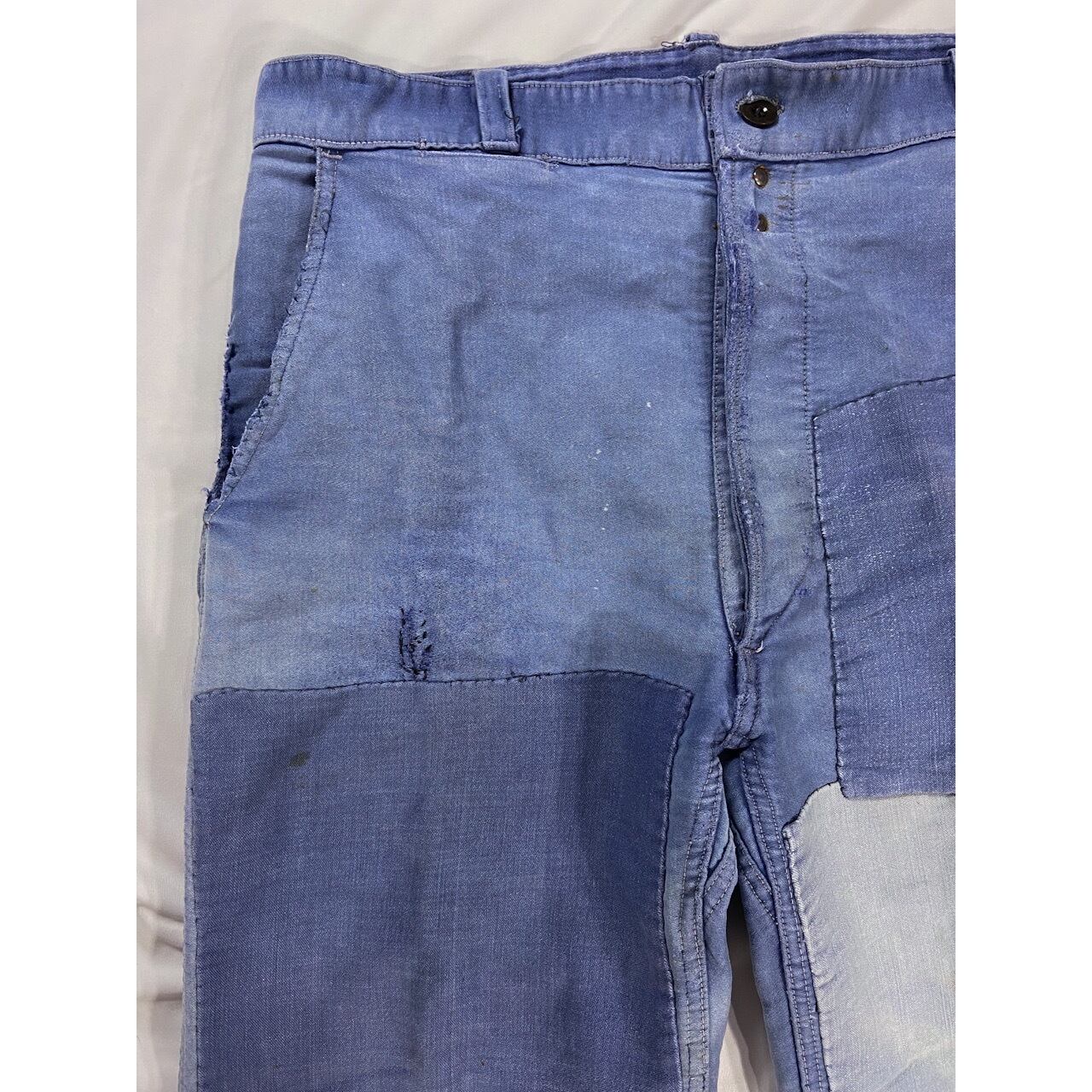 【1950s】"French Vintage" Blue Moleskin PatchWorked Work Trousers, Good Pattern!!