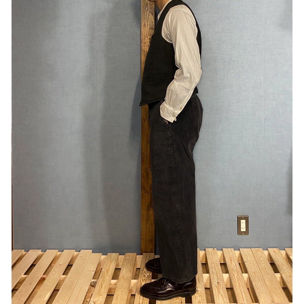 ふんわりとした生地が特徴で毛足短めの起毛感のある素材。ウエストに対して、極太なシルエットで極太パンツ好きにはたまらない形かと思います。