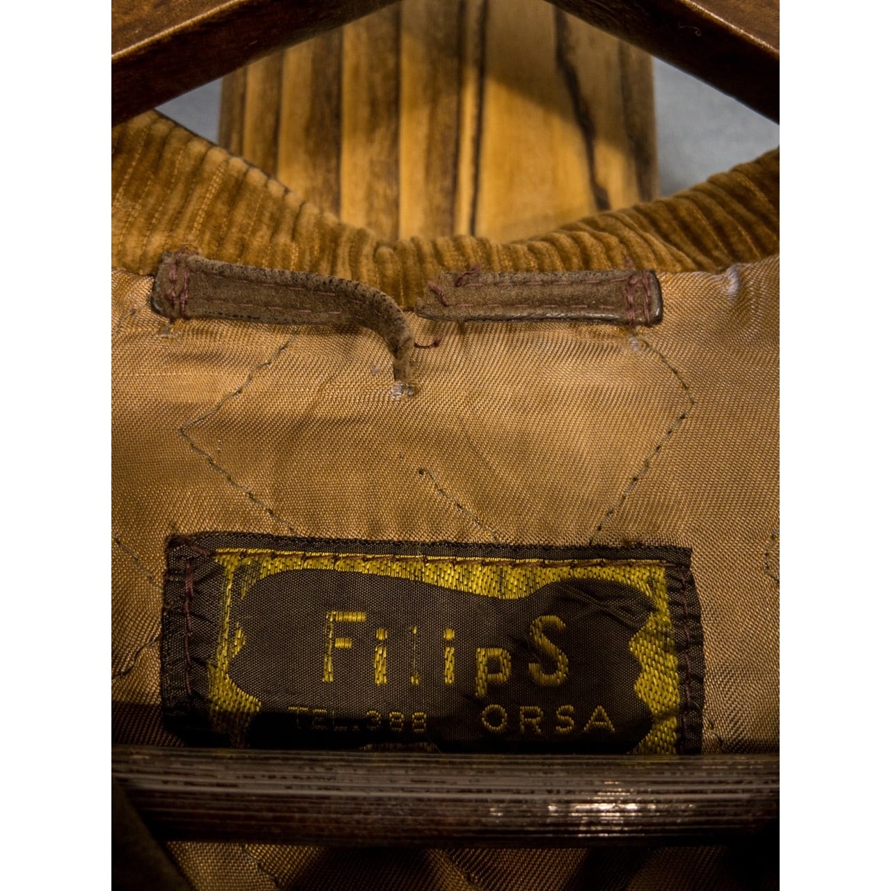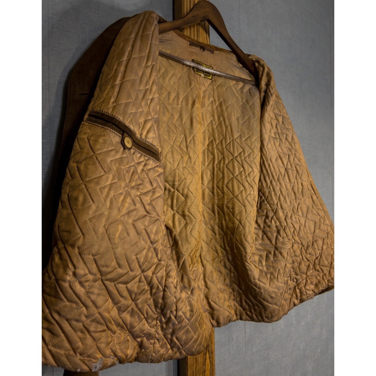 深いベージュカラーでスタンドカラーとノーカラーの中間のような首元は同系色のコーデュロイが使用されています。