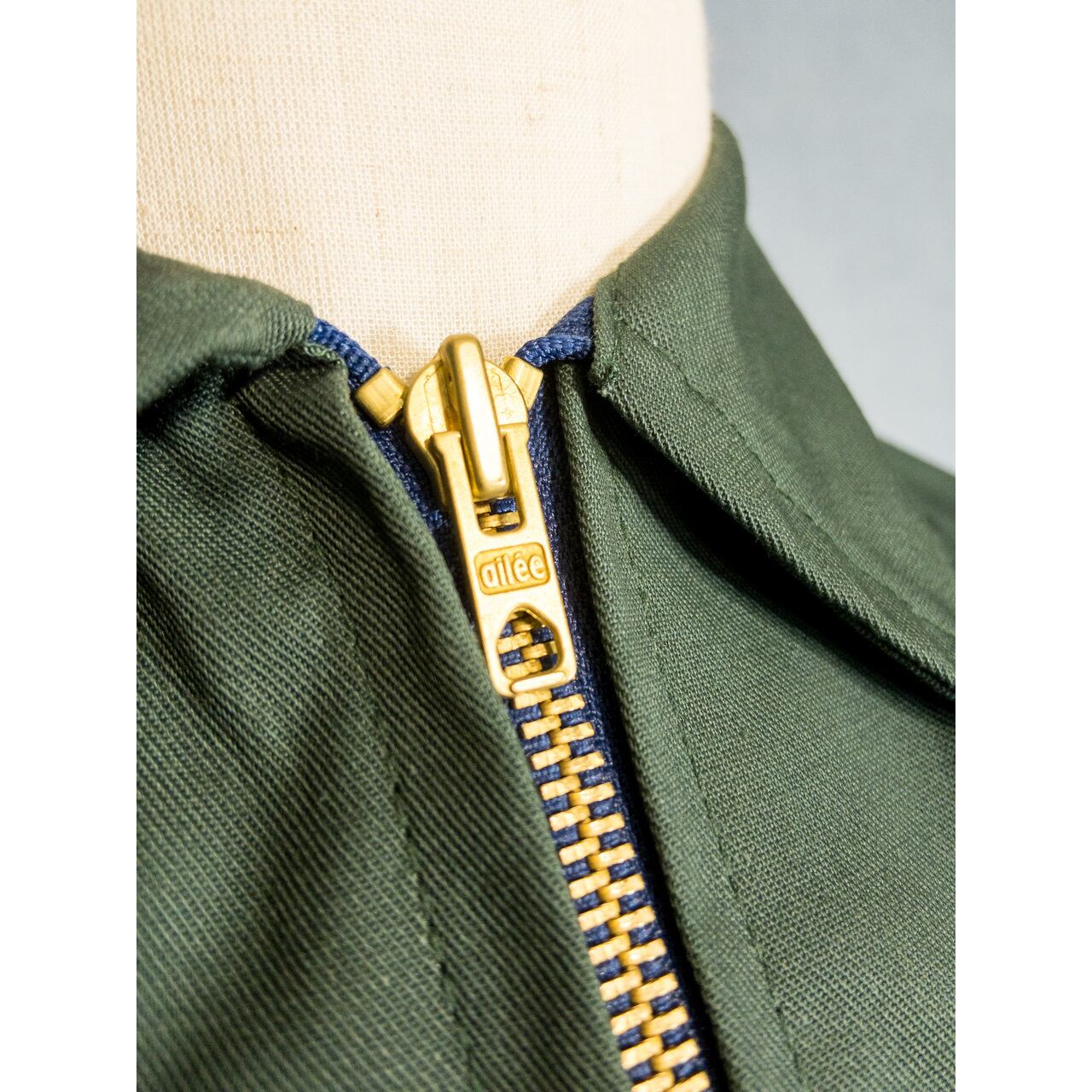 金ジップのパイピングにはブルーの生地が使われており、ガバッと羽織った時にちらりと見えるブルーとゴールドの雰囲気が◎