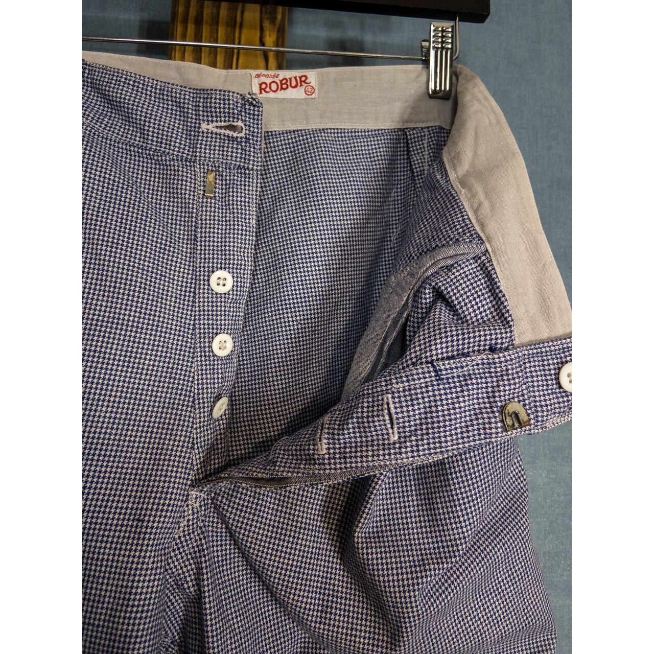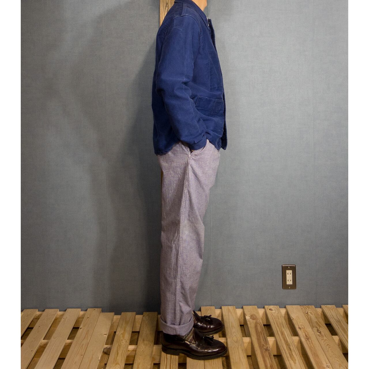 当時のお肉屋やコックなど食品関係の幅広い労働者に着用されていたパンツで、爽やかな見た目が印象的です。