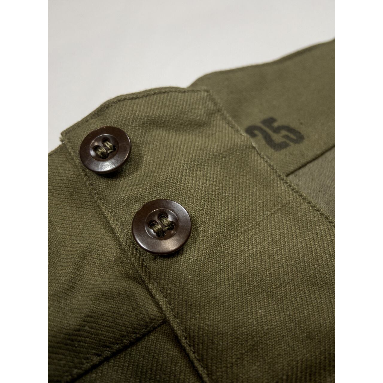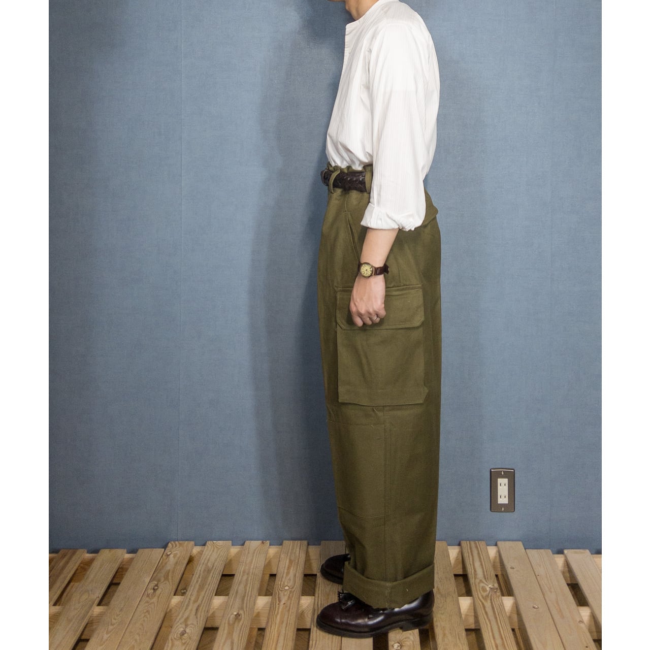 ディテールに関しては、極太かつワイドなシルエットで両太ももあたりのマチ付きカーゴポケットが特徴的。裾のフラップやヒップの丸みを帯びたフラップポケット、二重構造になった膝の補強、ポケット付近の縫製など、随所にフレンチミリタリーのクオリティの高さを感じることができる名品です。