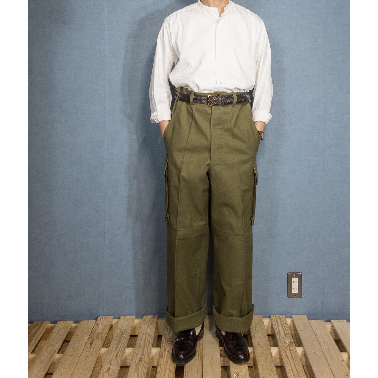 ディテールに関しては、極太かつワイドなシルエットで両太ももあたりのマチ付きカーゴポケットが特徴的。裾のフラップやヒップの丸みを帯びたフラップポケット、二重構造になった膝の補強、ポケット付近の縫製など、随所にフレンチミリタリーのクオリティの高さを感じることができる名品です。