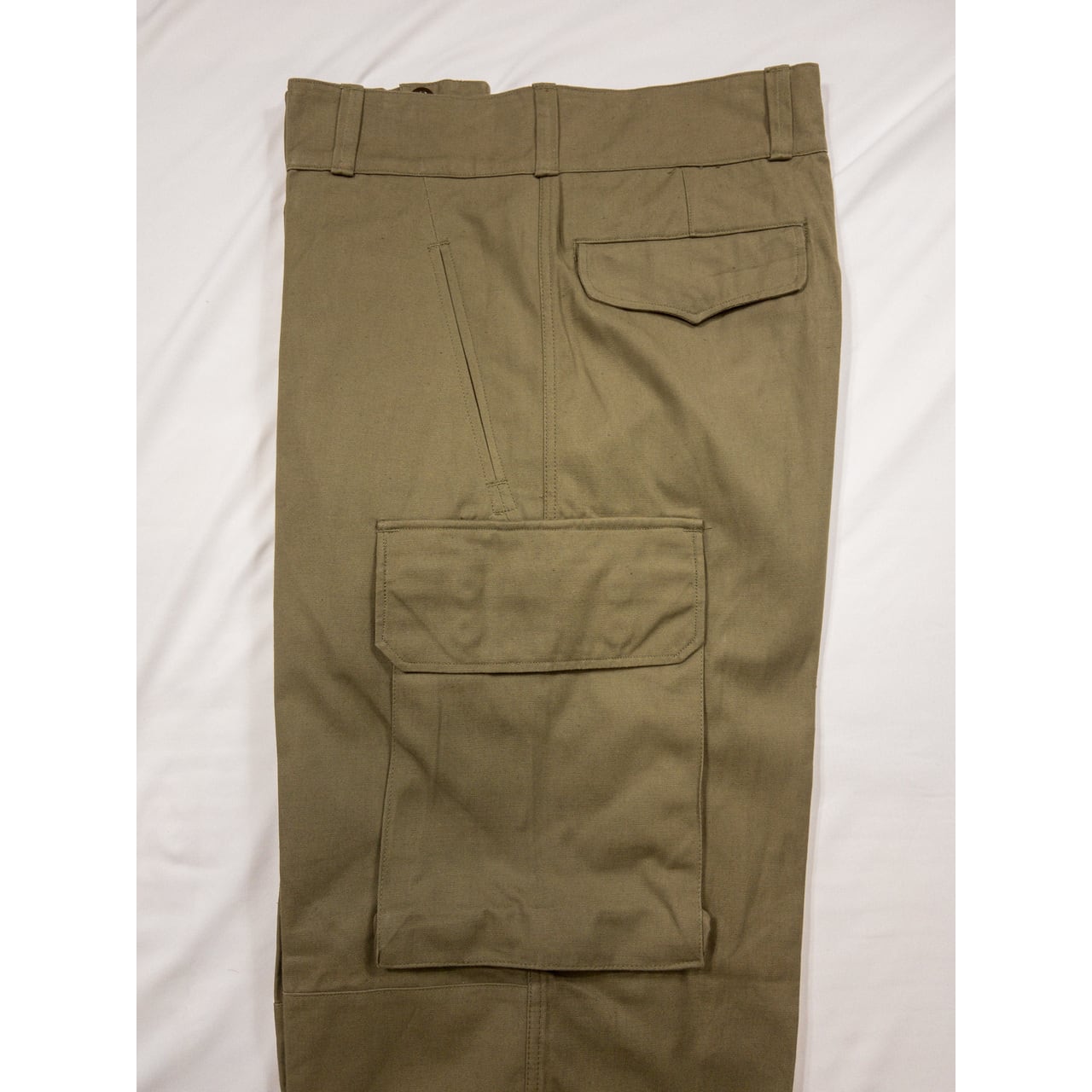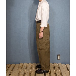 ディテールに関しては、極太かつワイドなシルエットで両太ももあたりのマチ付きカーゴポケットが特徴的。裾のフラップやヒップの丸みを帯びたフラップポケット、二重構造になった膝の補強、ポケット付近の縫製など、随所にフレンチミリタリーのクオリティの高さを感じることができる名品です。