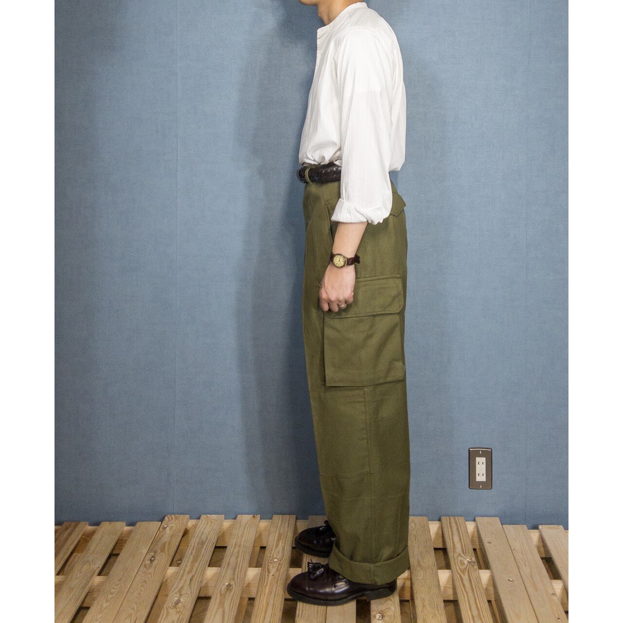 ディテールに関しては、極太かつワイドなシルエットで両太ももあたりのマチ付きカーゴポケットが特徴的。裾のフラップやヒップの丸みを帯びたフラップポケット、二重構造になった膝の補強、ポケット付近の縫製など、随所にフレンチミリタリーのクオリティの高さを感じることができる名品です。