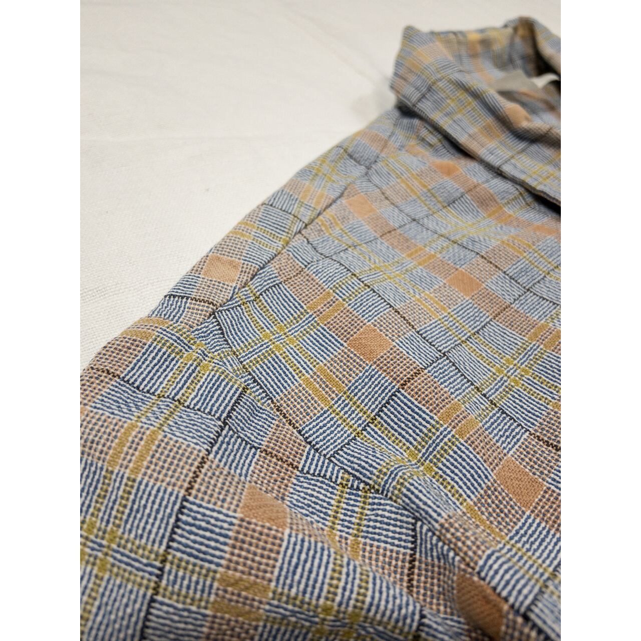こちらは淡いブルーベースにオレンジの太いラインとイエローの細いラインが特徴的な、良い配色のデザイン。表面は凹凸のあるシアサッカーのような生地感で、フレンチヴィンテージでは中々見ない生地かと。