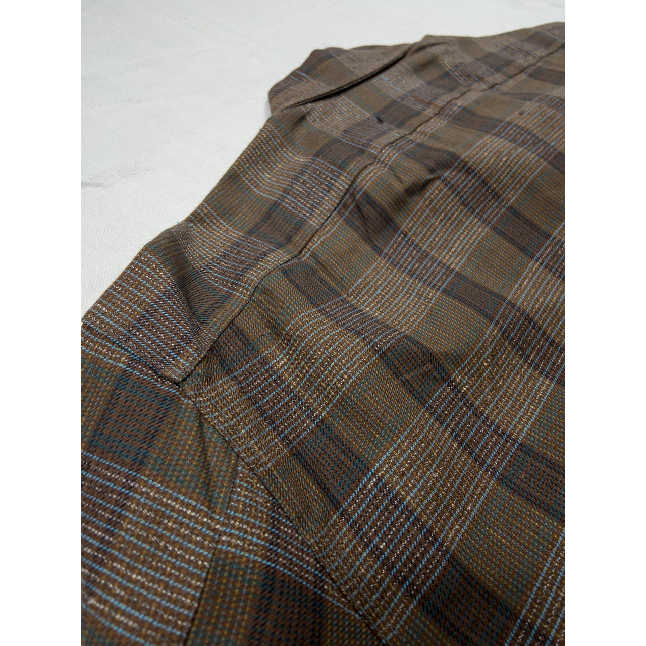ブラウンをベースに、グリーンやブルーの糸で織り成されたチェック柄。