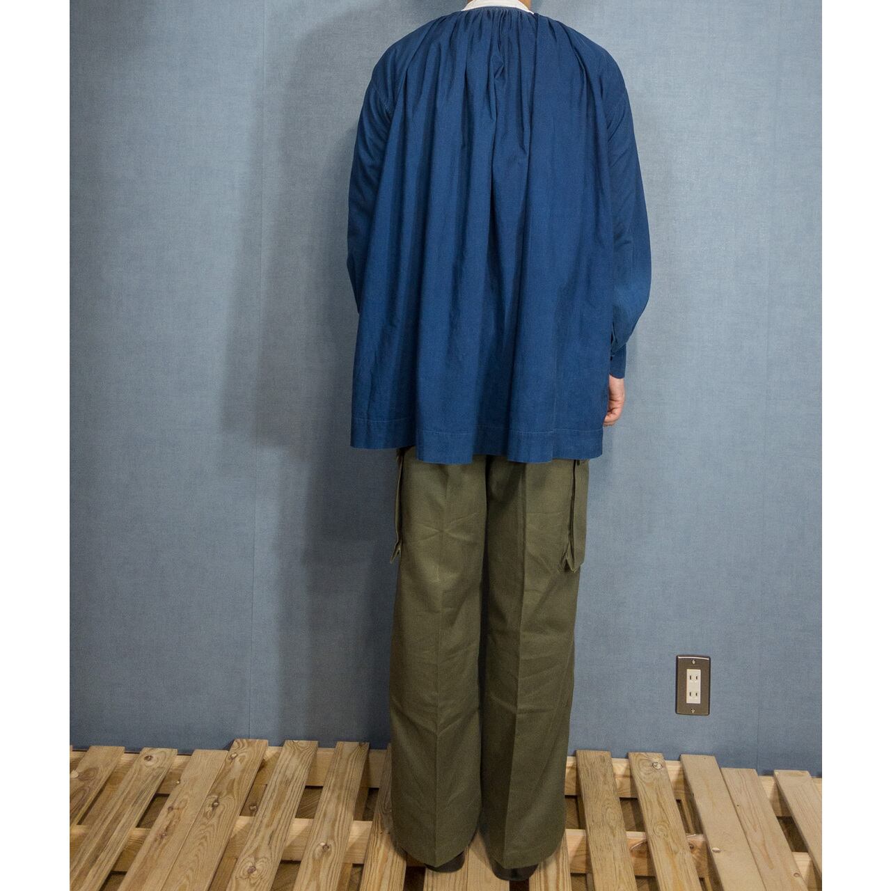 フロントはプルオーバータイプ。襟周りや袖周り、肩にはこれでもかというほどのギャザーと、手縫いの縫製。現代の技術では再現することが困難であろうディテールが随所に確認できます。