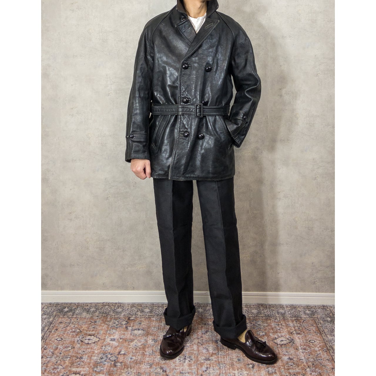 【1940-50s】"Italian Vintage" Black Double Breasted Goatskin Leather Tankist Jacket, Good Condition