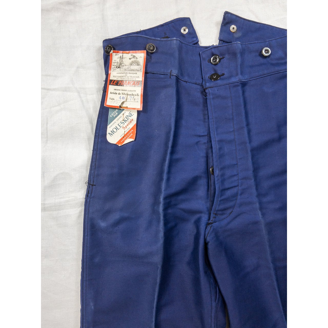 こちらは1940年代頃のフランス製ブルーモールスキンワークトラウザーズになります。