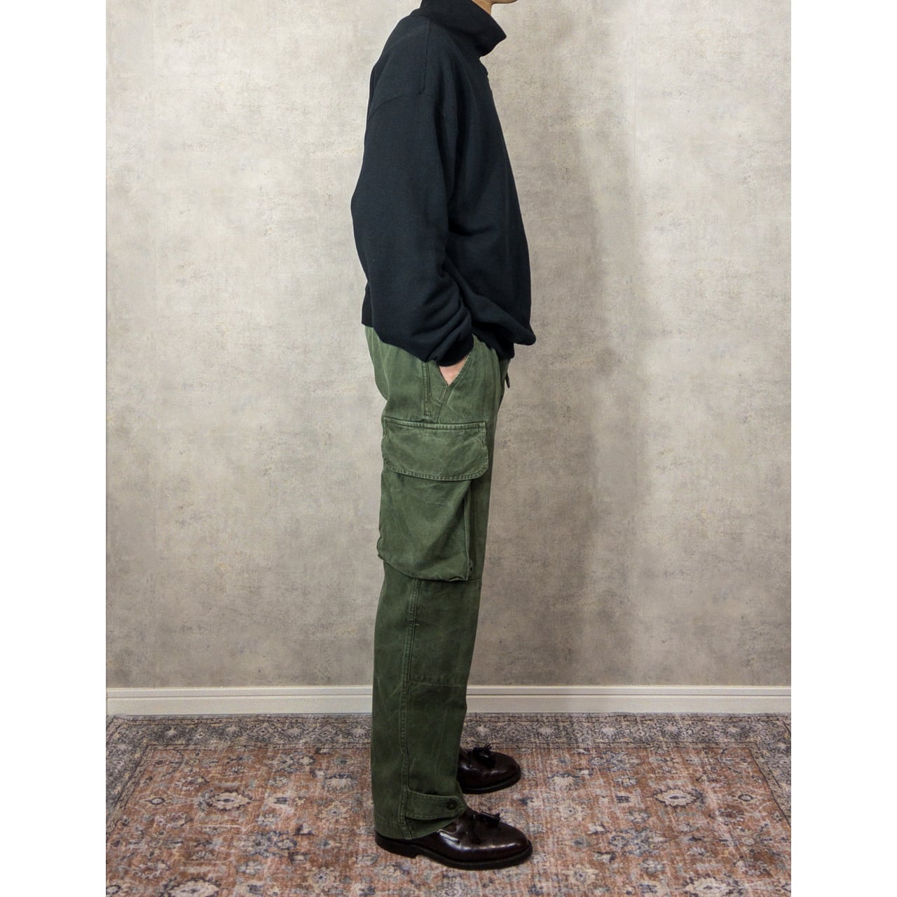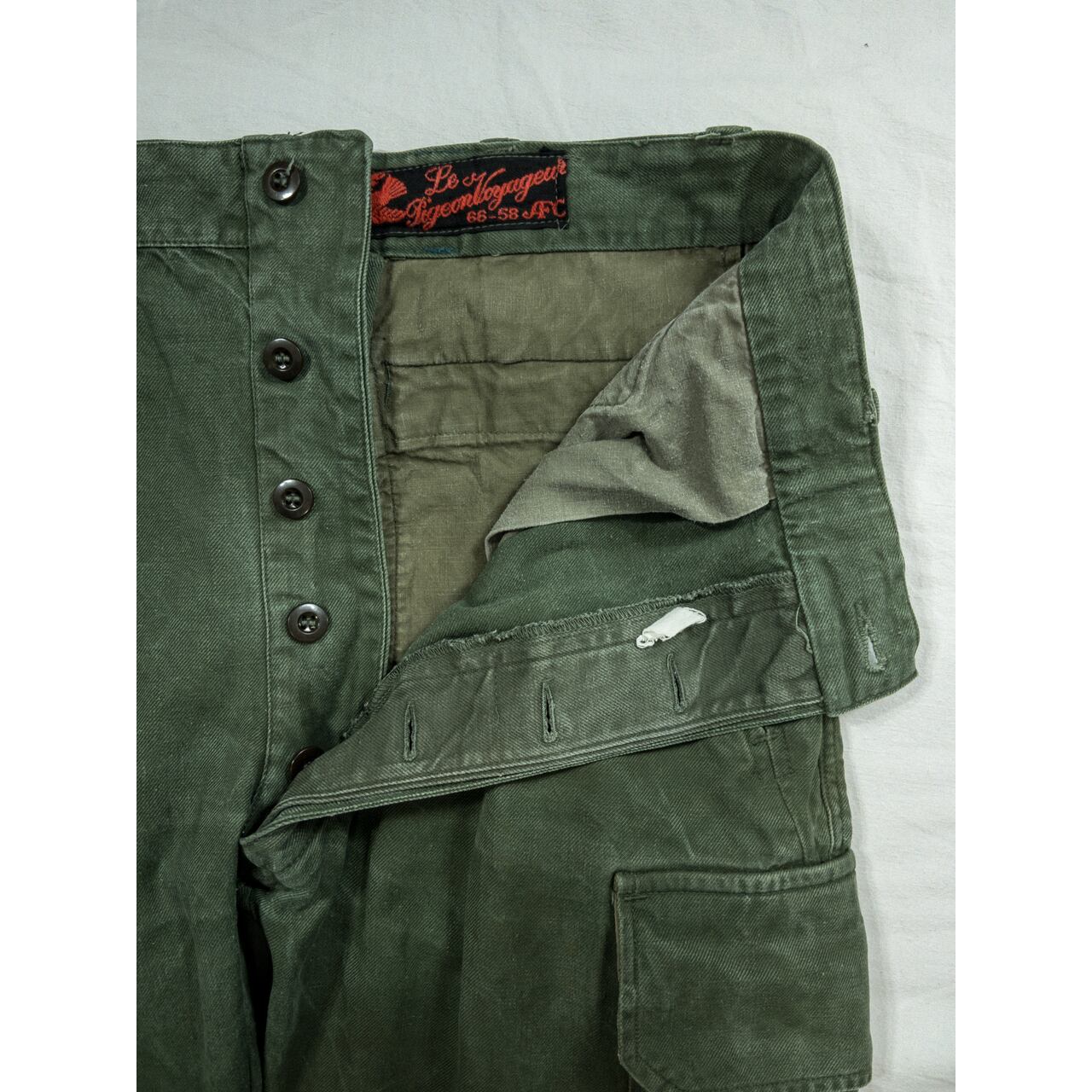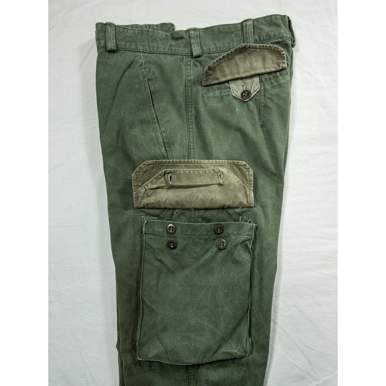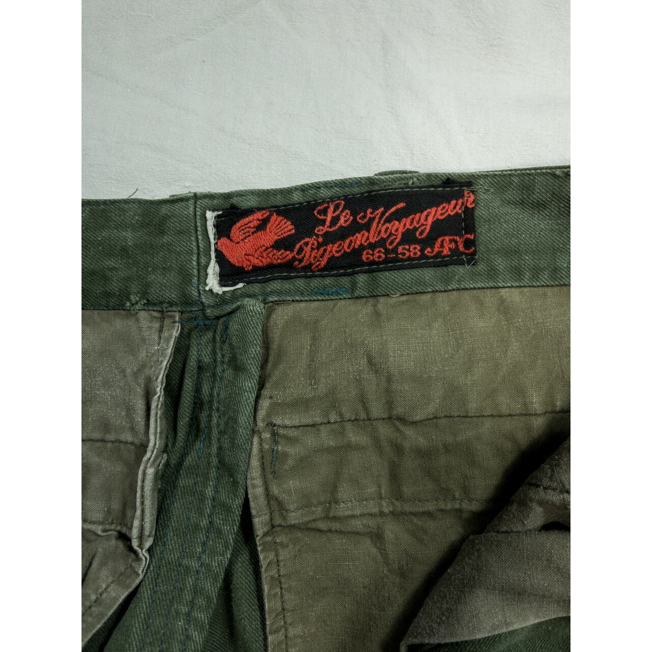 ディテールに関しては、ワイドなシルエットで両太ももあたりのマチ付きカーゴポケットが特徴的。裾のフラップやヒップの丸みを帯びたフラップポケット、二重構造になった膝の補強、ポケット付近の縫製など、随所にフレンチミリタリーのクオリティの高さを感じることができる名品です。