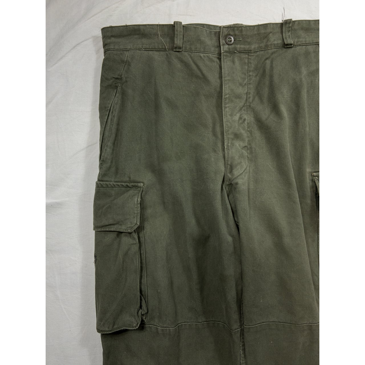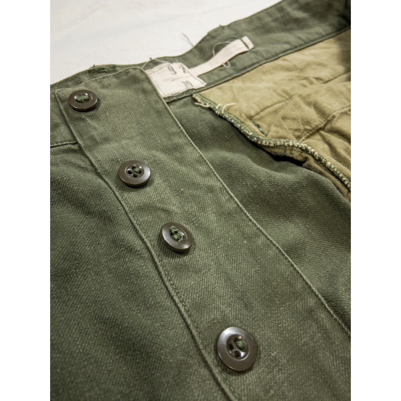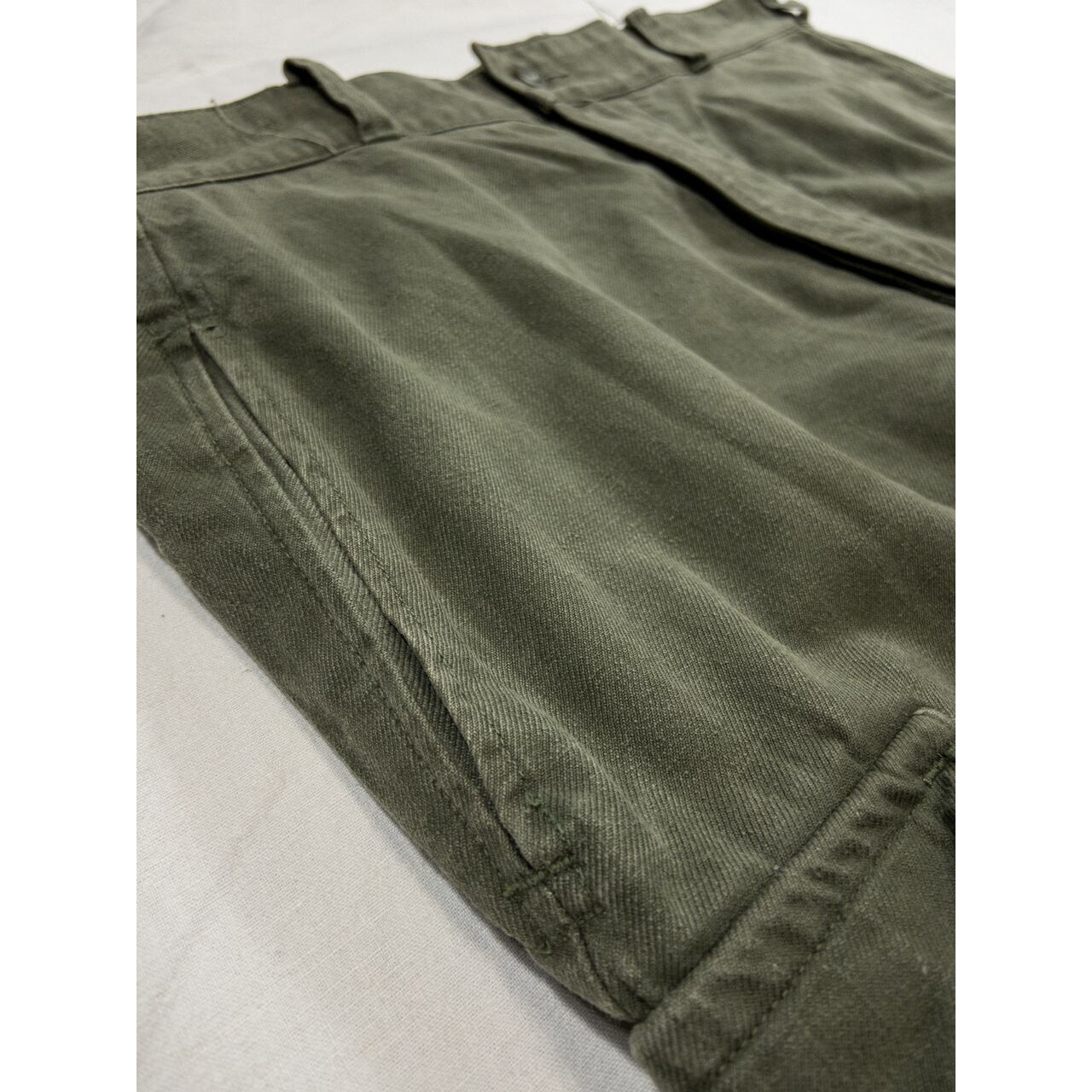 ディテールに関しては、ワイドなシルエットで両太ももあたりのマチ付きカーゴポケットが特徴的。裾のフラップやヒップの丸みを帯びたフラップポケット、二重構造になった膝の補強、ポケット付近の縫製など、随所にフレンチミリタリーのクオリティの高さを感じることができる名品です。