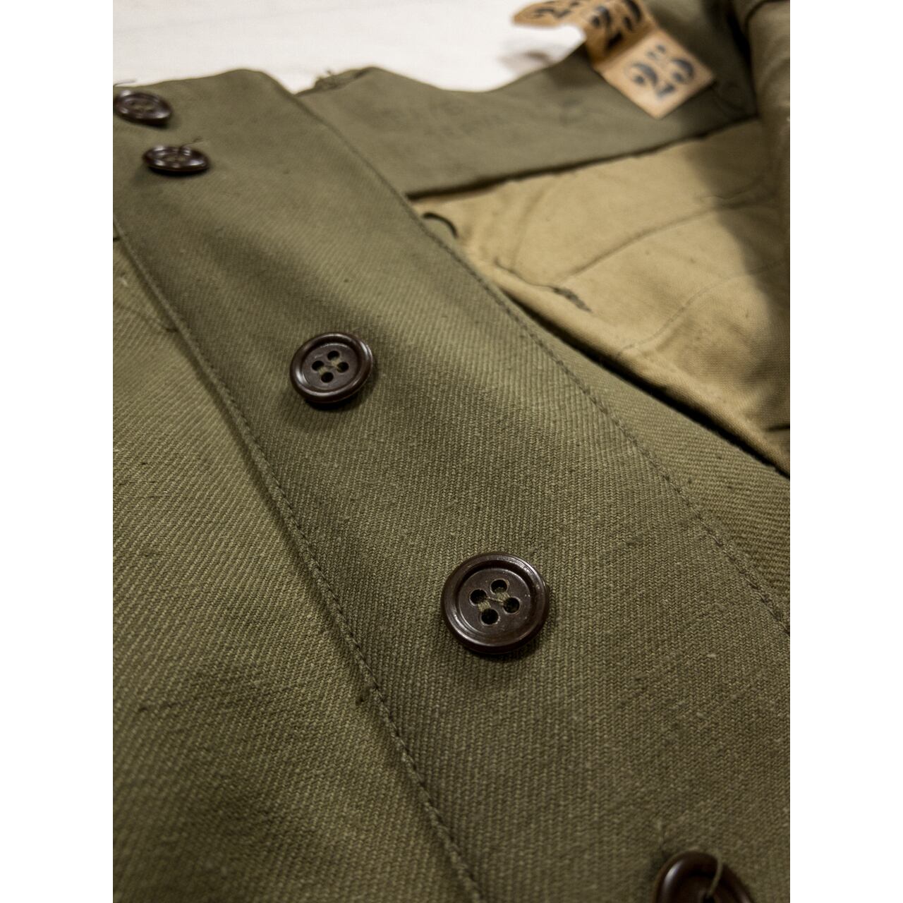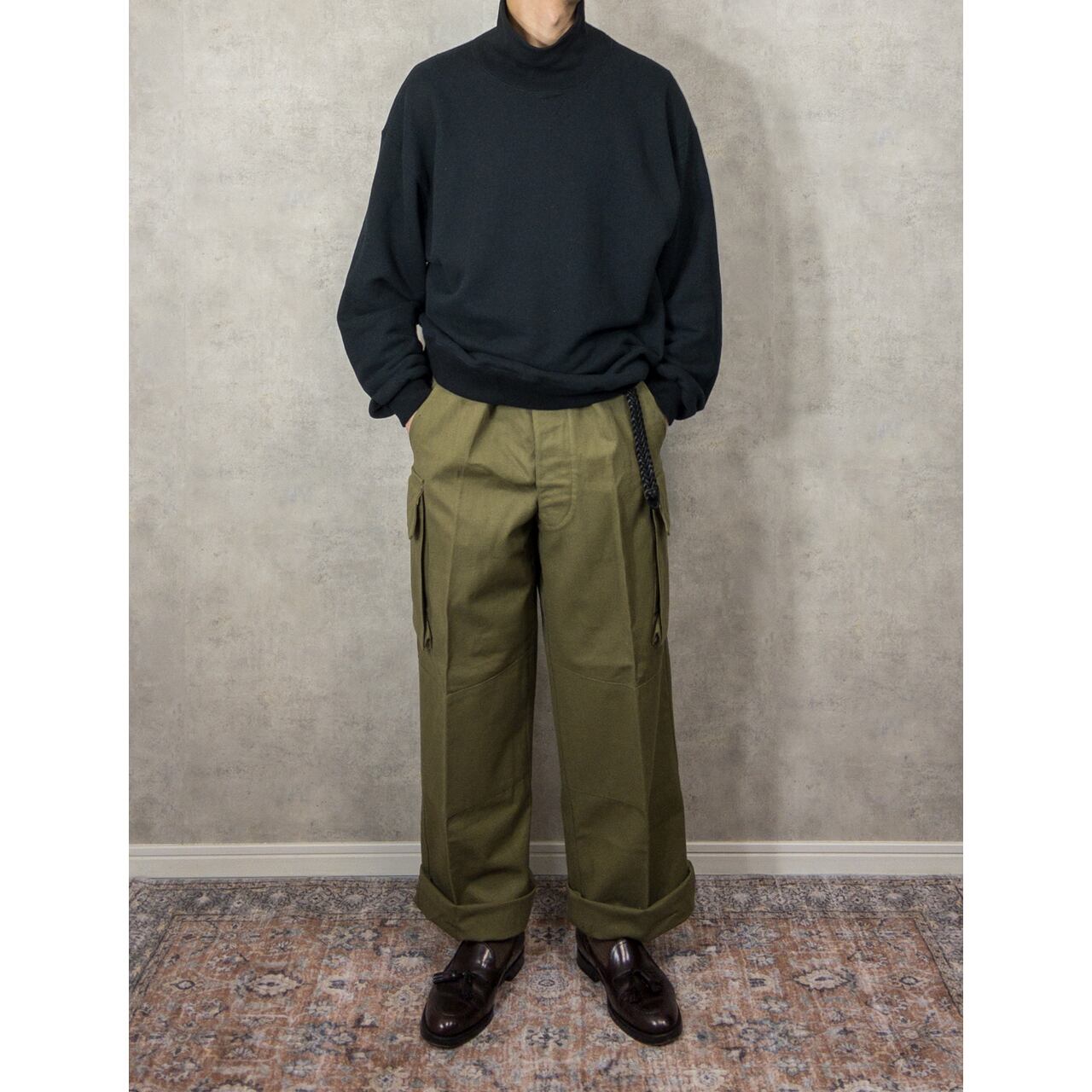 ディテールに関しては、ワイドなシルエットで両太ももあたりのマチ付きカーゴポケットが特徴的。裾のフラップやヒップの丸みを帯びたフラップポケット、二重構造になった膝の補強、ポケット付近の縫製など、随所にフレンチミリタリーのクオリティの高さを感じることができる名品です。