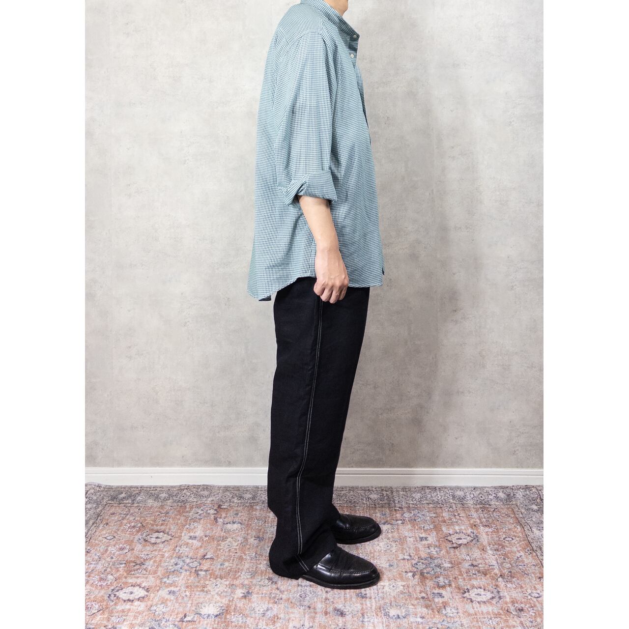 ウエストが大きめの個体ではありますが、ベルトループ付きなのでベルトで絞って履くことも。