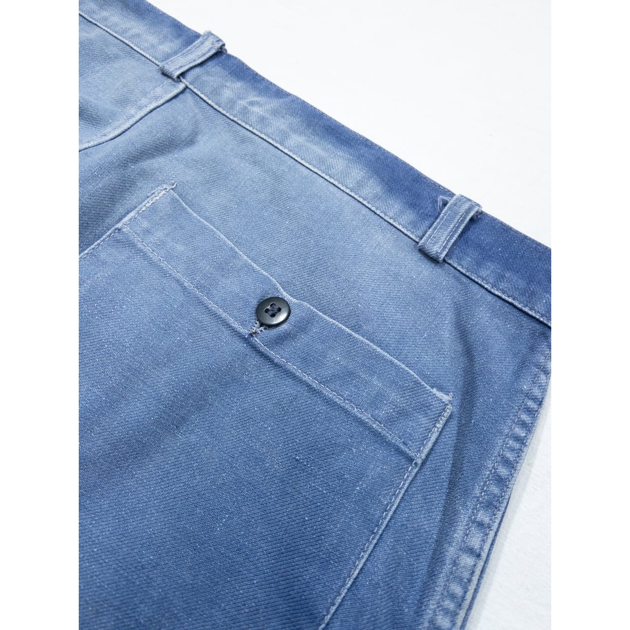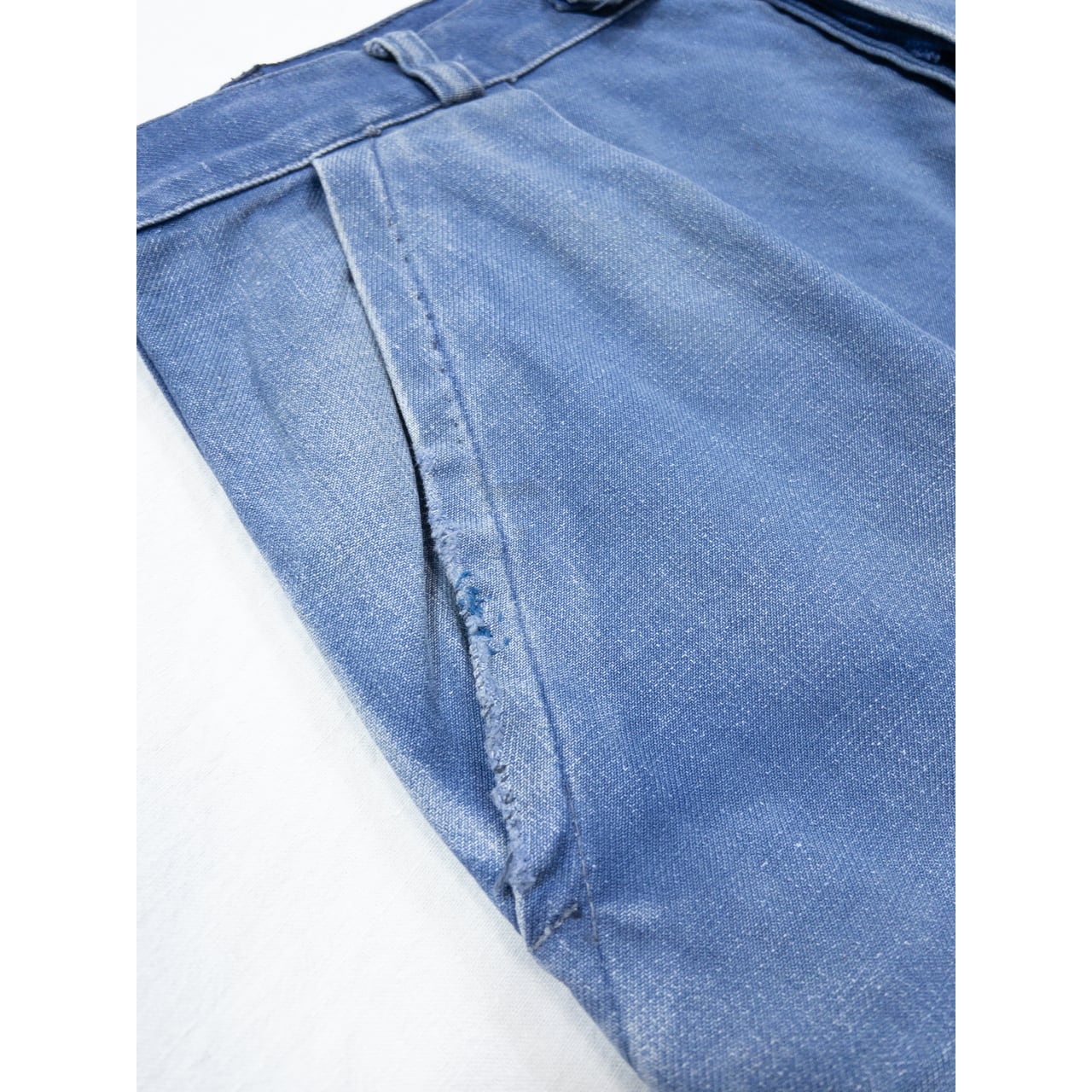 生地はフレンチヴィンテージ定番のコットンツイル生地ではありますが、特に太もも周りはツイルが擦り減って平織りのような表情に。