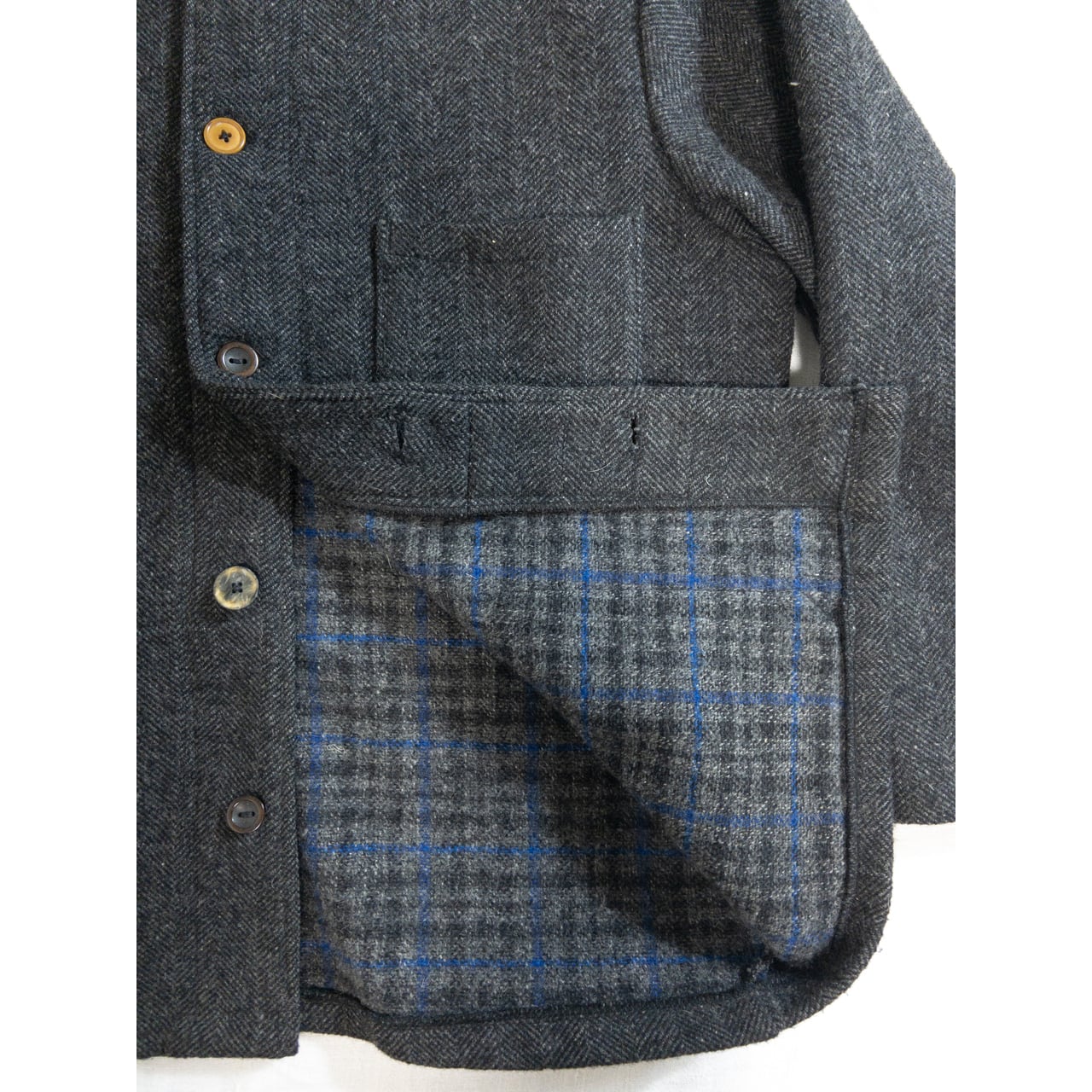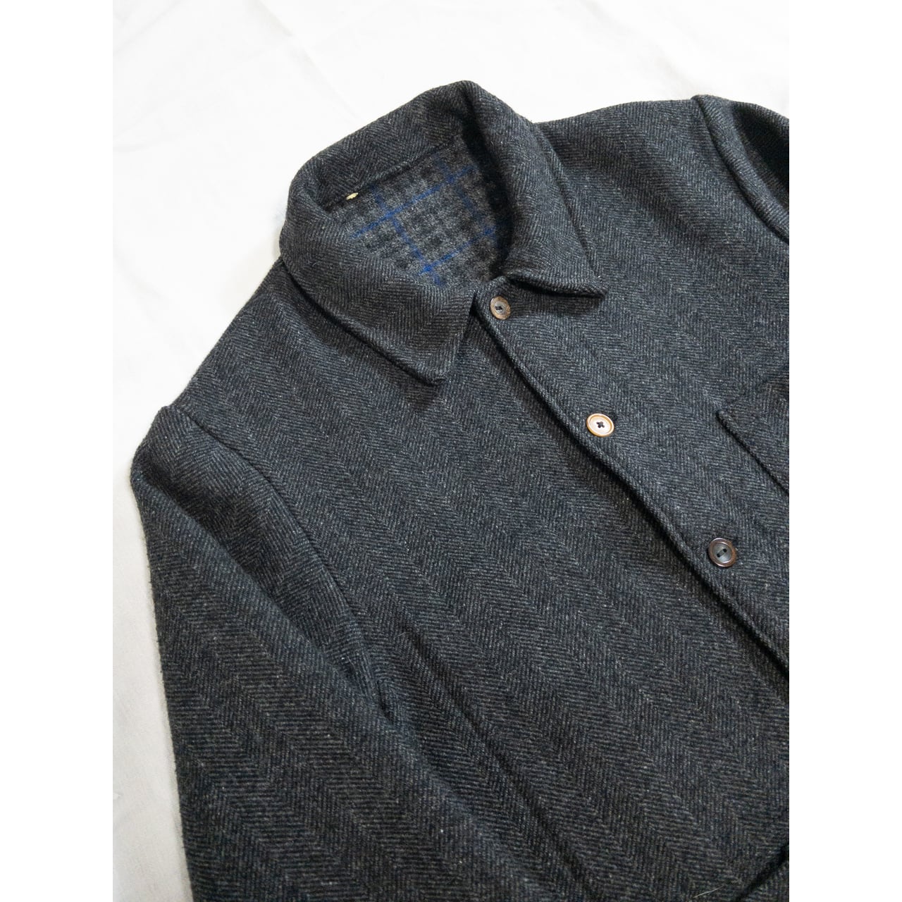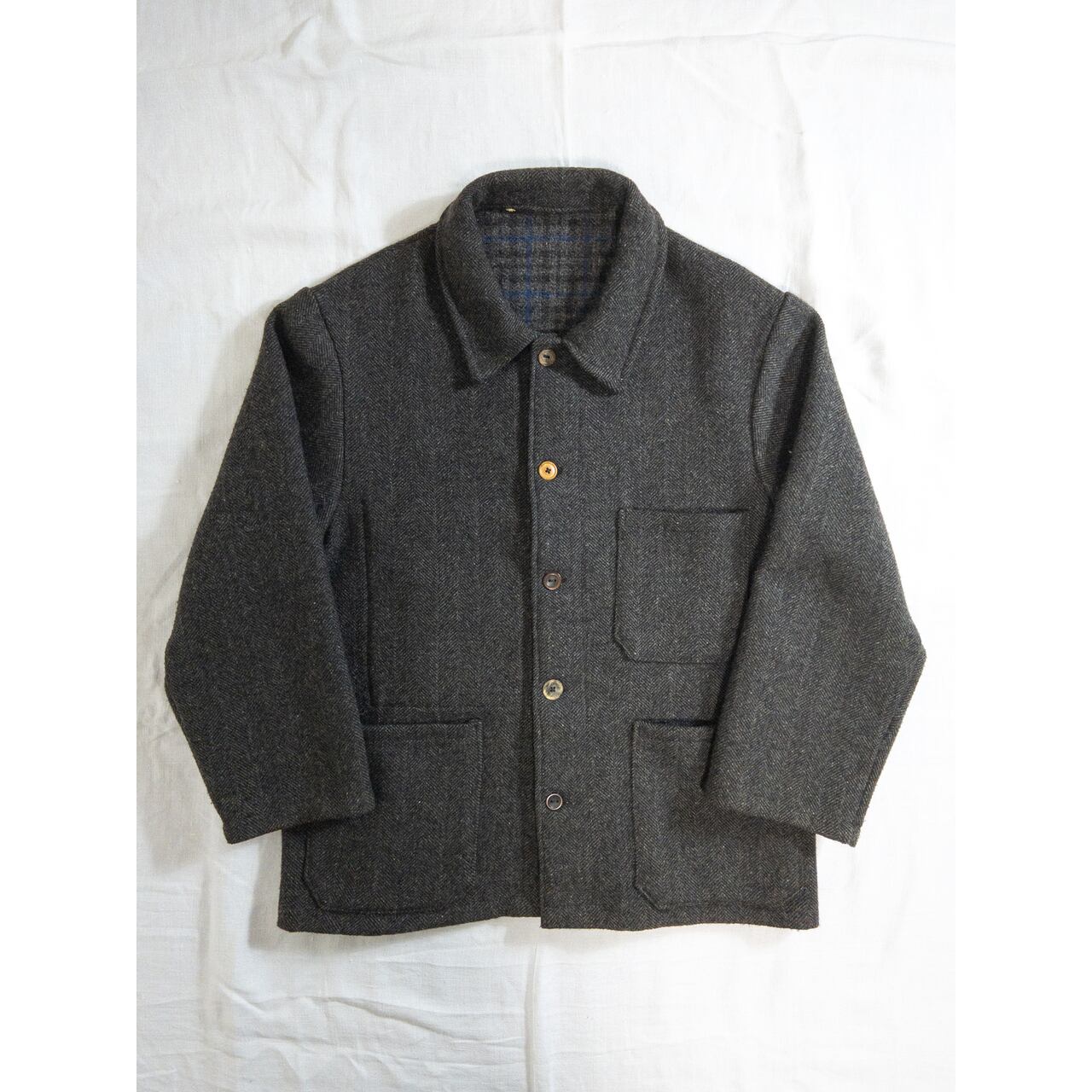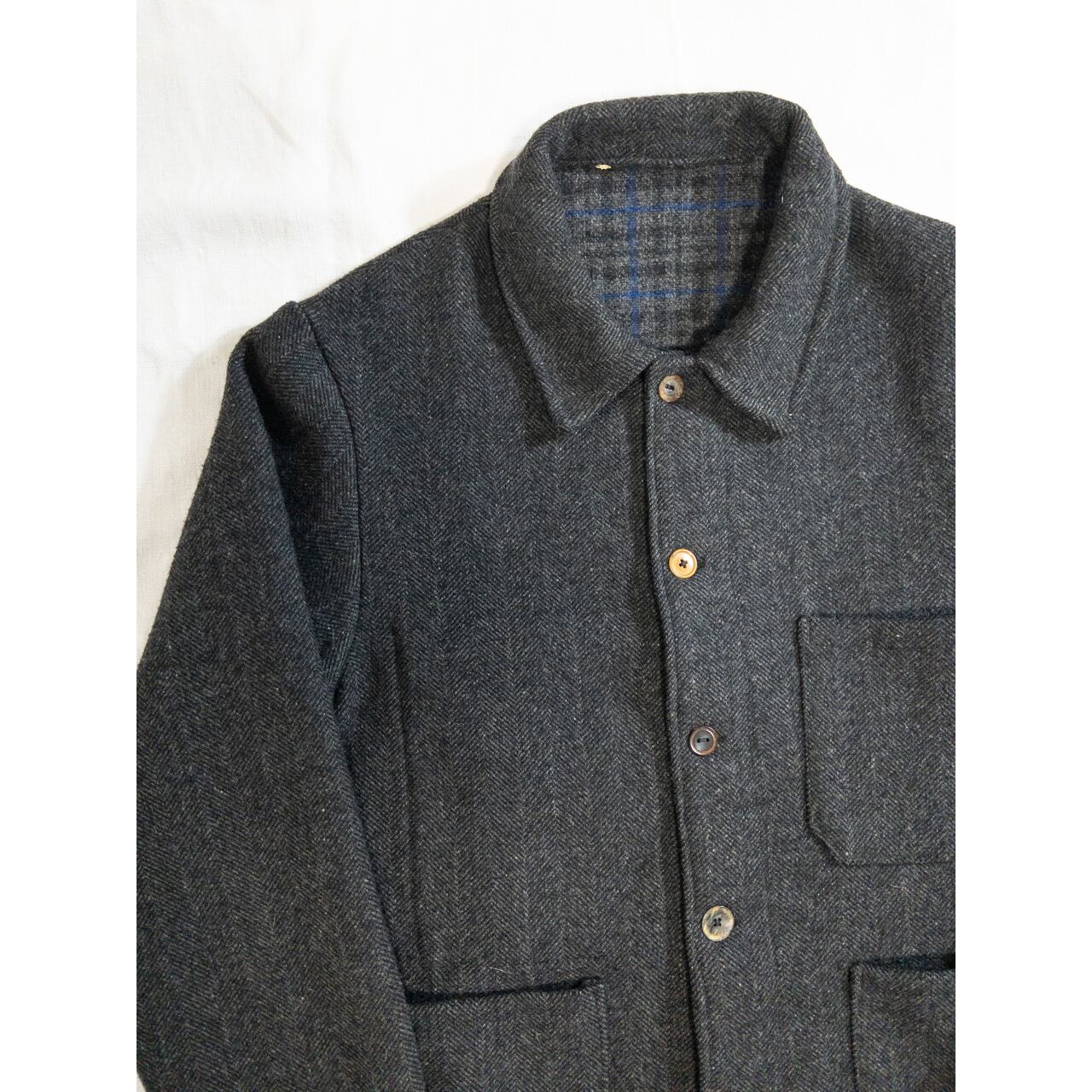 大柄なヘリンボーンツイルに柿の木ボタン。